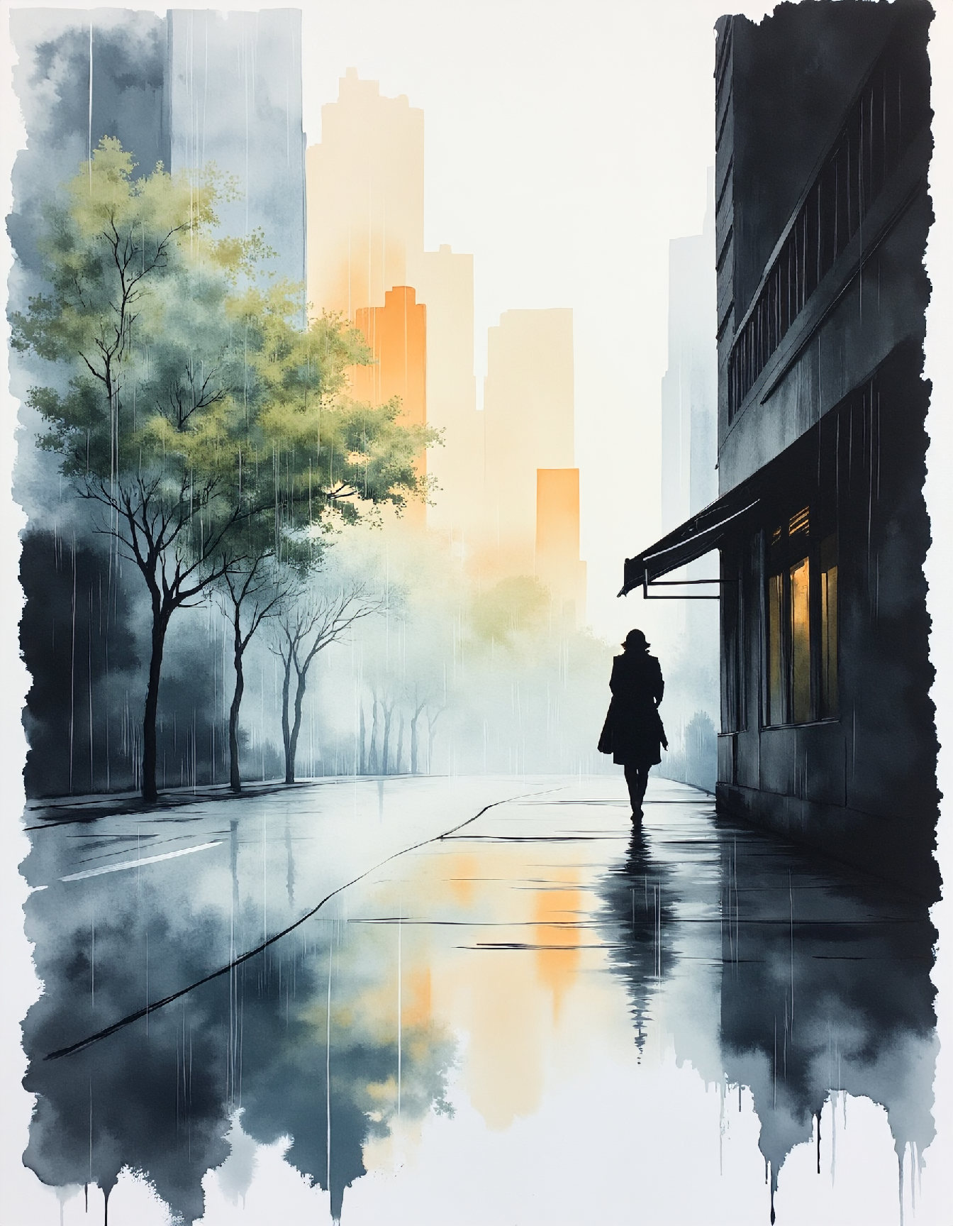 ArsMJStyle, Expressive Watercolor Ink Wash, A minimal watercolor painting depicts a modern city street drenched by heavy rain; droplets cascade from overhead, illuminating wet pavement and reflections on windows; solitary figure huddles under awning; blurred background merges trees and skyscrapers into abstract forms; muted color palette emphasizes textures; composition focuses on atmospheric effects rather than detailed architecture or figures. Soft watercolor rendering, use of negative space, calm tones, detailed droplet patterns.