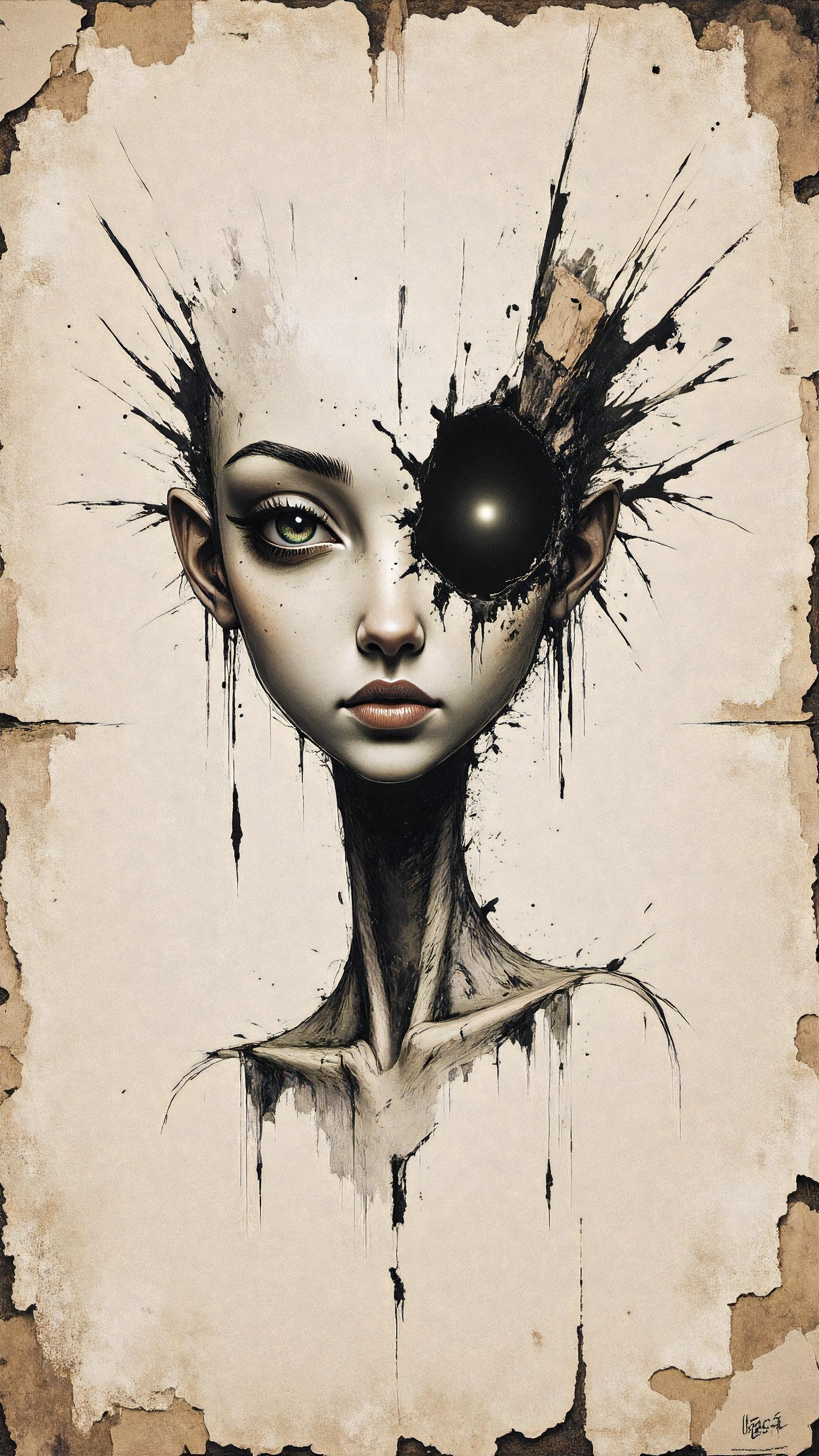 Aged Paper Dollmaster, Female figure with chipped mask and vacant gaze, Minimalistic graphite lines for marionettes, Sepia hues blending into pencil shading, Worn tear marks along paper edges, Hint of swirling dust, Eerie antiquated stillness
