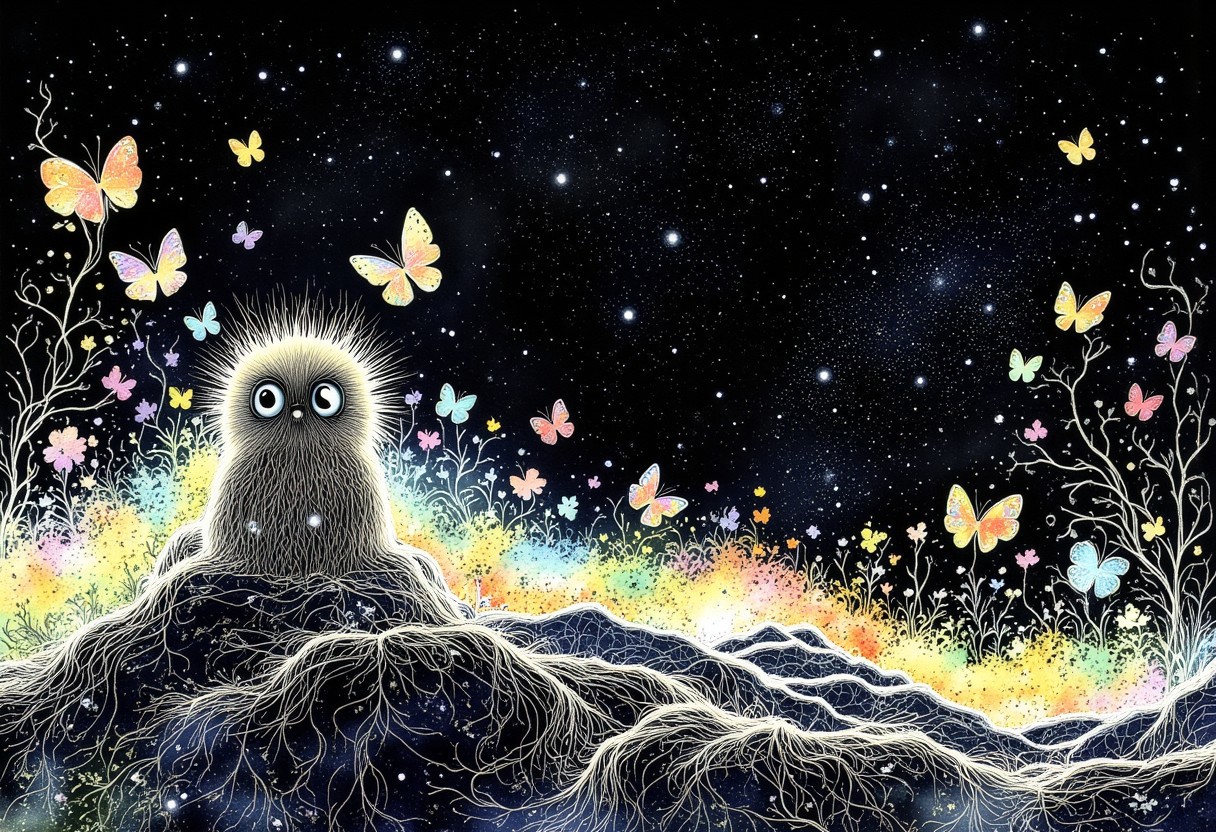 a gritty graphic illustration, Studio Ghibli Dark Fairytale, masterpiece, best_quality, detailed_eyes, dark chromatic_colors, monochrome palette, fairytale_landscape, cute_creature, multicolored_fur, sitting, rainbow, magical, starry, butterflies,