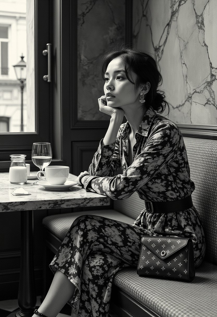 Black-and-white photograph capturing a poised model seated in a quaint Parisian café setting on a long upholstered bench. She lays her knees on the seat of the bench. She wears a sophisticated printed outfit, a long-sleeved dress adorned with whimsical patterns of icons and motifs, exuding classic elegance with a modern twist. Her sleek, styled hair frames her face gracefully as she rests her chin lightly on her hand, her gaze playful yet contemplative. The table is set with delicate café essentials: a white porcelain coffee cup, a glass of water, a milk pitcher, and neatly arranged butter and jam packets, evoking a leisurely European morning atmosphere. A Louis Vuitton clutch lies on the table, adding a touch of luxury and refinement to the scene. The woven café bench and marble wall in the background enhance the intimate, timeless ambiance. The soft interplay of light and shadow accentuates the textures of the fabric, the table, and the surrounding details. perfect cue, cinematic film style, award-winning picture, highly detailed, ultra-high resolutions, 32K UHD, sharp focus, (photorealistic:1.5), (Extremely realistic, masterpiece, top quality, official art, best quality, beautiful and aesthetic:1.2), 4k, 8k, very rich details, Sony A7R IV 60MP, Sony FE 50mm f/1.4 GM II Lens, F/8.0