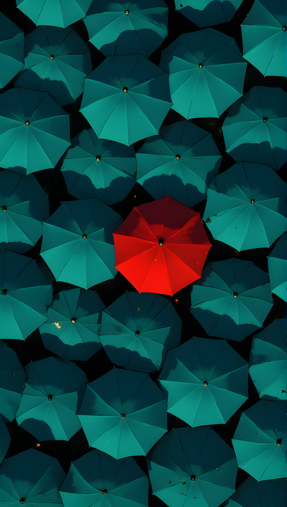 The image is a striking visual representation of individuality and standing out from the crowd. It features a dense cluster of gray umbrellas, all uniformly open and arranged in a grid-like pattern. The umbrellas are tightly packed together, creating a sea of gray that dominates the scene. In the center of this uniform expanse, there is a single red umbrella that stands out vividly against the monochromatic backdrop. The bright red color of the central umbrella draws the viewer's attention immediately, symbolizing uniqueness, leadership, or breaking away from conformity. The contrast between the red umbrella and the surrounding gray ones creates a powerful and memorable image, emphasizing the concept of being different and making an impact. j_art, anime, anime art, <lora:FLUX\jul\J_Anime:0.8>, <lora:FLUX\RealAnime:0.8>
