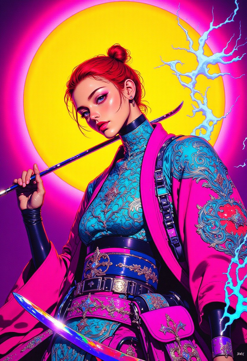 A highly detailed digital illustration inspired by 90s anime and pop art, featuring an adult girl in a vibrant, modernized Japanese kimono against a neon-infused, electrifying background. She has a radiant golden complexion and short, fiery red hair tied in a high bun with loose strands framing her face. Her intense emerald-green eyes glow with energy, and her confident expression is highlighted by bold, colorful makeup. She holds a traditional Japanese flute in her left hand, while swirling, electric-blue energy crackles from her right hand, suggesting supernatural abilities. Her kimono is a striking magenta with intricate turquoise and silver patterns, including a large, luminous phoenix emblem on the back, layered over a deep blue undergarment visible at the collar and sleeves. She wears sleek violet footwear, and a cyan-glowing belt secures her attire. A shimmering katana with an iridescent blade rests beneath her right arm, while a small, stylish pouch with a futuristic design hangs from her waist. The background is a fusion of hot pink, electric yellow, and deep purple, with a massive neon sun radiating pulsating energy, blending retro-futurism with traditional Japanese aesthetics. The illustration’s style merges bold outlines, exaggerated color contrasts, and a high-energy composition, emphasizing intricate textures, dynamic lighting, and the intense interplay of vibrant hues, creating a striking mix of nostalgia and modern visual storytelling.
