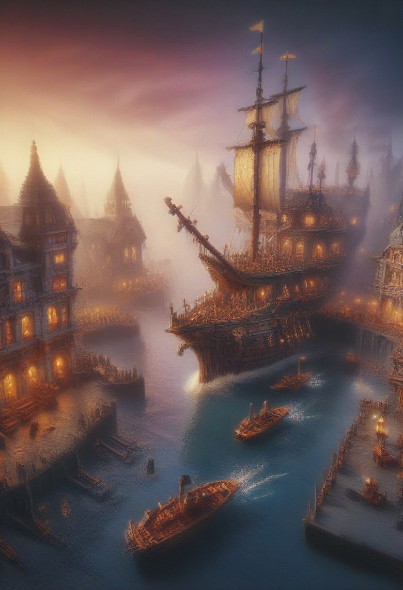 A highly detailed steampunk frigate sailing through a misty harbor, adorned with intricate brass gears and copper pipes. The ship features towering masts with billowing sails made of rich, textured fabrics, embellished with cogwheel patterns. Wisps of steam rise from the engine room, while glowing lanterns cast a warm, golden light across the deck. The backdrop showcases a bustling port city with Victorian architecture and airships floating in the sky, all under a dramatic sunset that bathes the scene in warm oranges and soft purples, creating a captivating and adventurous atmosphere.