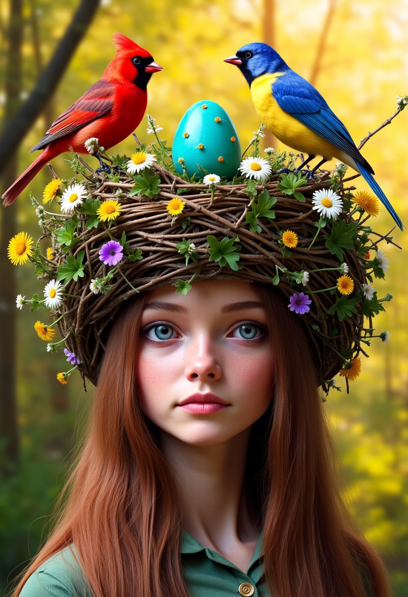 w1z_m4ch1n4, Extreme close-up portrait of a woman's head, framed from below her chin to well above her crown, with her face occupying only the bottom half of the composition. Camera angle positioned as at her forehead level. Her luxuriant chestnut-brown hair is entirely transformed into an elaborate, oversized bird nest that dominates the upper portion of the image. The nest should be at least twice the size of her face, with every strand of hair visibly woven, twisted, and sculpted to form the intricate structure. Individual hairs create the complex weaving patterns of twigs, with some strands fraying at the ends to mimic the texture of real nest materials. Small wildflowers—yellow dandelions, white daisies, and tiny purple blooms—sprout from the nest along with green leaves and tendrils that wrap around the structure. Nestled centrally in this hair-crafted nest sits a single robin's egg with a vivid turquoise-blue shell speckled with dark flecks. Two birds perch on opposite sides: a brilliant cardinal with crimson plumage, black face mask and pointed crest on the left, and a blue-headed bunting with cobalt head, vibrant yellow breast and blue wings on the right. Both birds should appear to be interacting with the nest, perhaps pulling at strands or arranging materials. The background features soft-focus forest scenery with dappled golden sunlight filtering through leaves. j_art