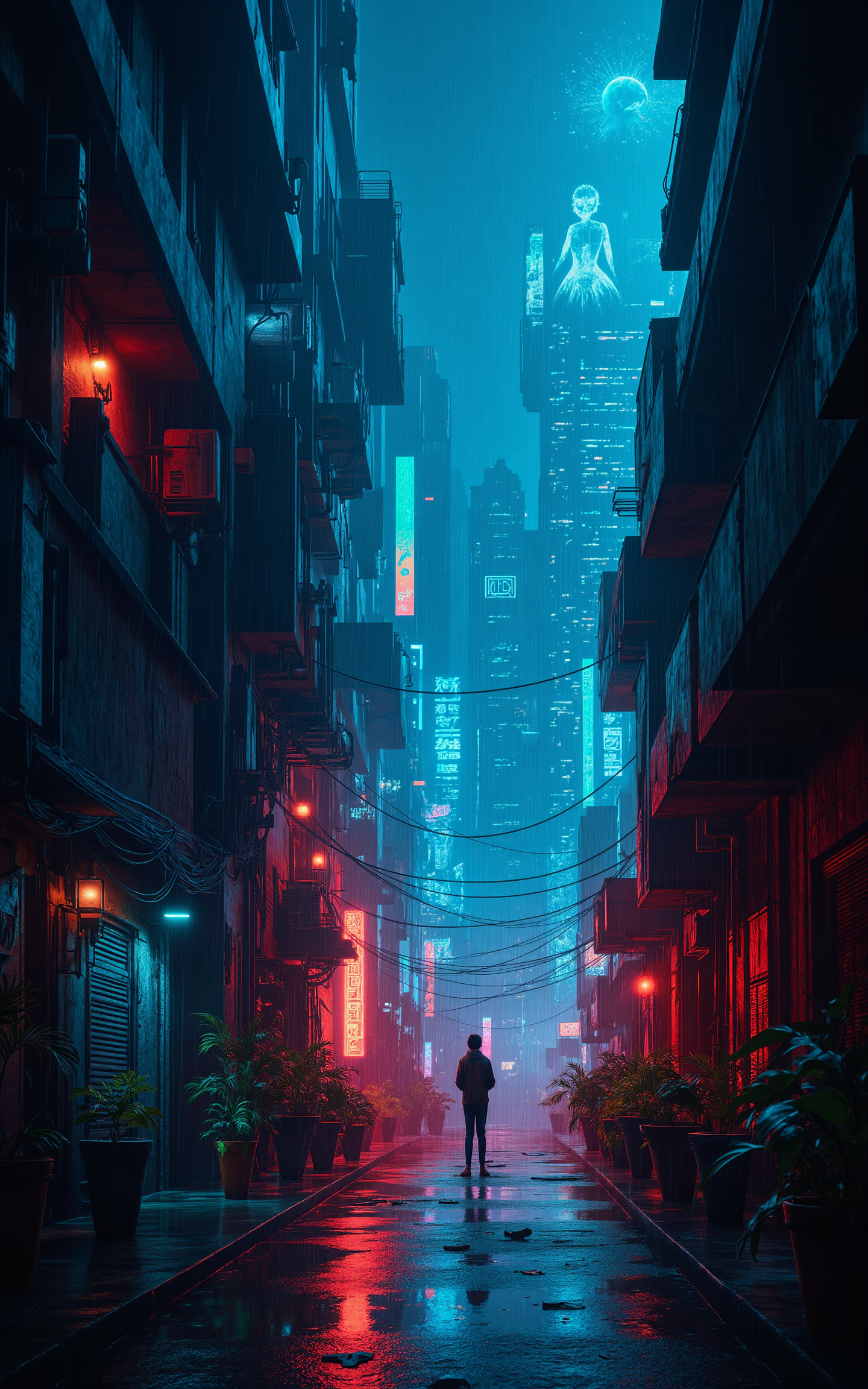 Cyberpunk cityscape of LuZhou,a futuristic metropolis constructed from flowing data streams. The neon night blends holographic projections with shimmering digital rain,casting a synthetic blue moonlight over towering cybernetic skyscrapers and remnants of ancient Chinese architecture. A lone cyber-hacker stands in the city's hidden network alley,decrypting lost data fragments in the rain. The fragmented memory of a vanished loved one appears as a ghostly,corrupted AI projection,flickering between unreadable code and a human silhouette. The scene is drenched in blue,red,and green neon hues,blending nostalgia and the cold touch of technology. Hyper-detailed,cinematic composition,photorealistic reflections,depth of field.,<lora:kcyberpunk-01:0.8>,kcyberpunk,