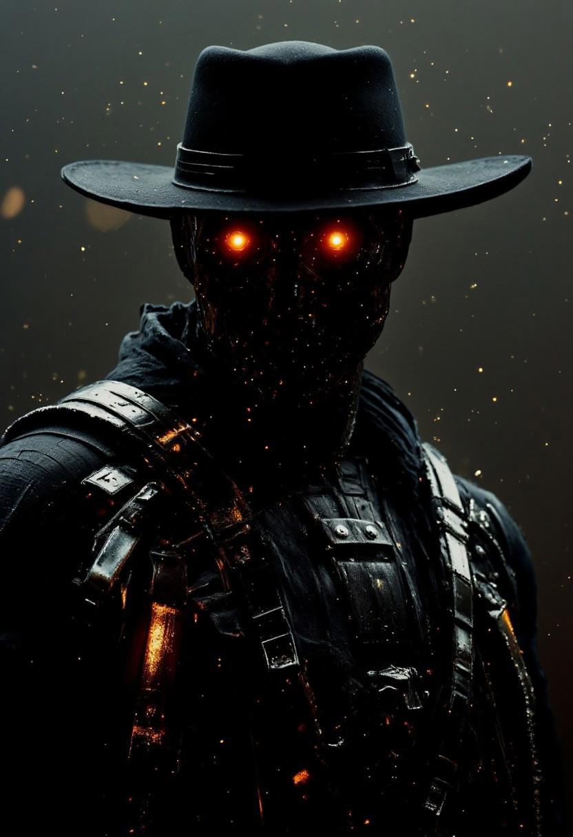 Cyberpunk, dark, mysterious, futuristic, male, android, cowboy, hat, black, suit, coat, mechanical, arms, eyes, red, background, still life, art, high fashion, detailed, realistic, close-up, studio, solid black, dark, severe, unreadable, intense, expressionless, high contrast, sharp details, detailed mechanical parts, yellow optics, full body, military, dark moody, fantasy, futuristic fashion, avant garde, noir, art deco, portrait, full-frame, front view, single subject, deep shadows, matte, metallic, textured, technological (((visible through layers of optical, ghostly light leaks and chaotic chromatic aberration,A washed-out, overexposed vision, bleached neon light, edges dissolving into flickering white burns, optical distortion, ghostly light leaks:2)))