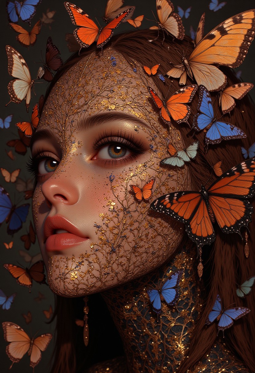 (highly detailed:1.3, hyper-realistic:1.3) illustration of a (woman:1.2) with a (butterfly-themed face:1.4). Captures (almond-shaped eyes:1.2), (full lips:1.2), (warm-toned skin:1.2) with (freckles:1.1). (auburn, messy hair:1.2) frames her face. Dense cluster of (butterflies:1.5) in shades of (crimson:1.2, gold:1.2, violet:1.2), featuring (intricate patterns:1.3) and (iridescent hues:1.3). (butterflies:1.5) appear (emerging from her face:1.4), creating a (surreal:1.3, enchanting:1.3) effect. (shimmering gold dust:1.3) on skin enhances the (illusion:1.3) of (butterflies:1.5) merging with her face. (background:1.1) is (out of focus:1.2), emphasizing (intricate details:1.3) of (butterflies:1.5) and (woman’s face:1.3). (dreamy:1.3, ethereal atmosphere:1.4). Blend of (realism:1.3) and (fantasy:1.3), merging (natural beauty:1.2) with (magical elements:1.4), evoking (wonder:1.3) and (enchantment:1.3).
