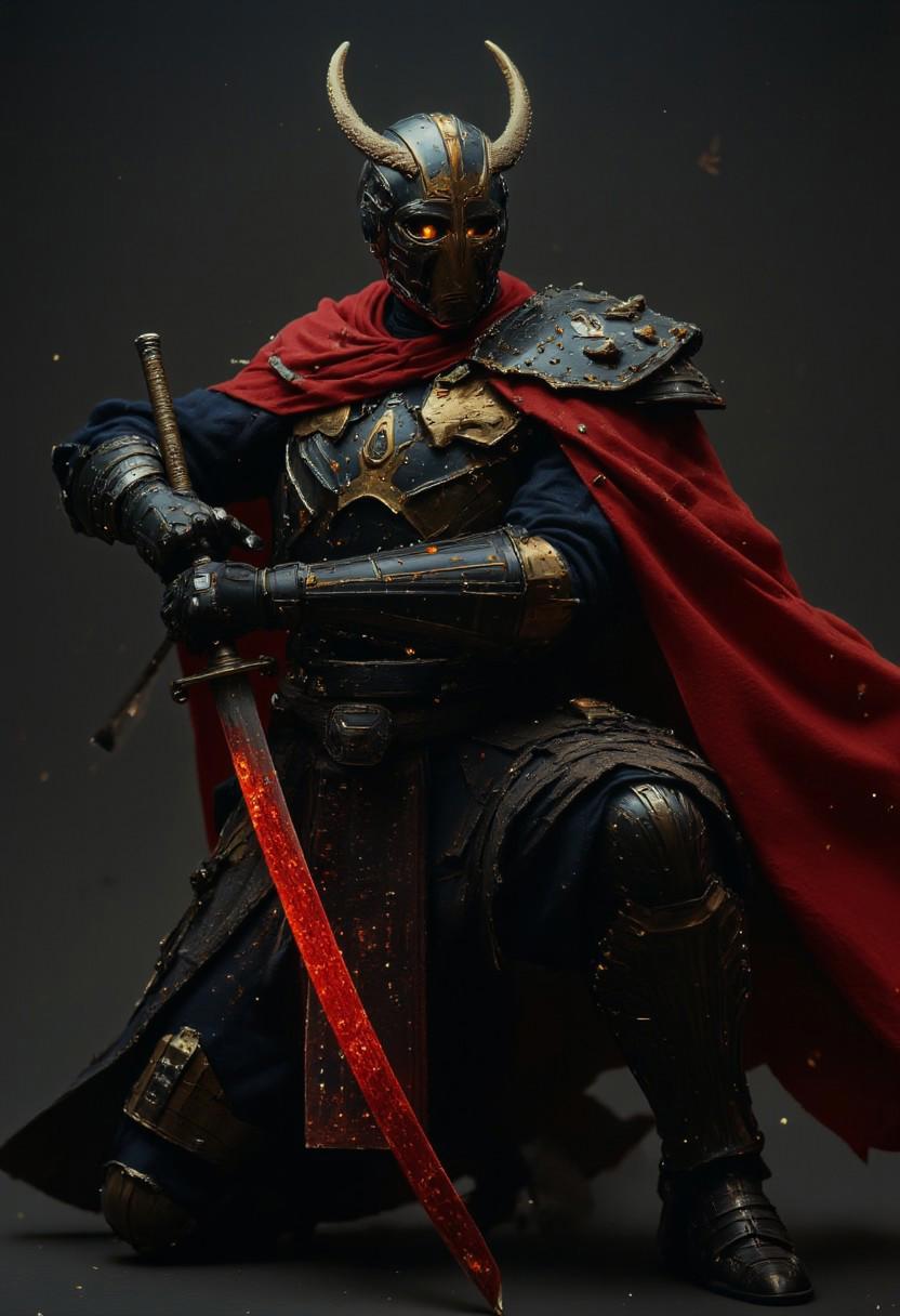Cyberpunk samurai warrior, poised fighting stance, holding katana. Full body shot, dark and dramatic lighting, sharp focus on the intricate details of the mechanized samurai armor. Metallic black armor with glowing yellow accents, highlighted with red accents, exposing mechanical parts and circuits. Red cape flowing behind, accented with black. Large katana with a glowing red blade, emphasizing the dynamic action. Sharp, angular features, robotic head design. Mechanical eyes with glowing light. A serious expression, intense focus, high-tech and futuristic aesthetic. Digital painting style, photorealistic rendering, with a cinematic quality and dark atmosphere. Detailed textures show the smooth metal surfaces and layered clothing. Close-up perspective showcasing the armor's detailed designs. Dark gray background with a slight vignette effect. High contrast. Cyberpunk, mecha, fantasy art, digital art, 3D rendering, highly detailed.