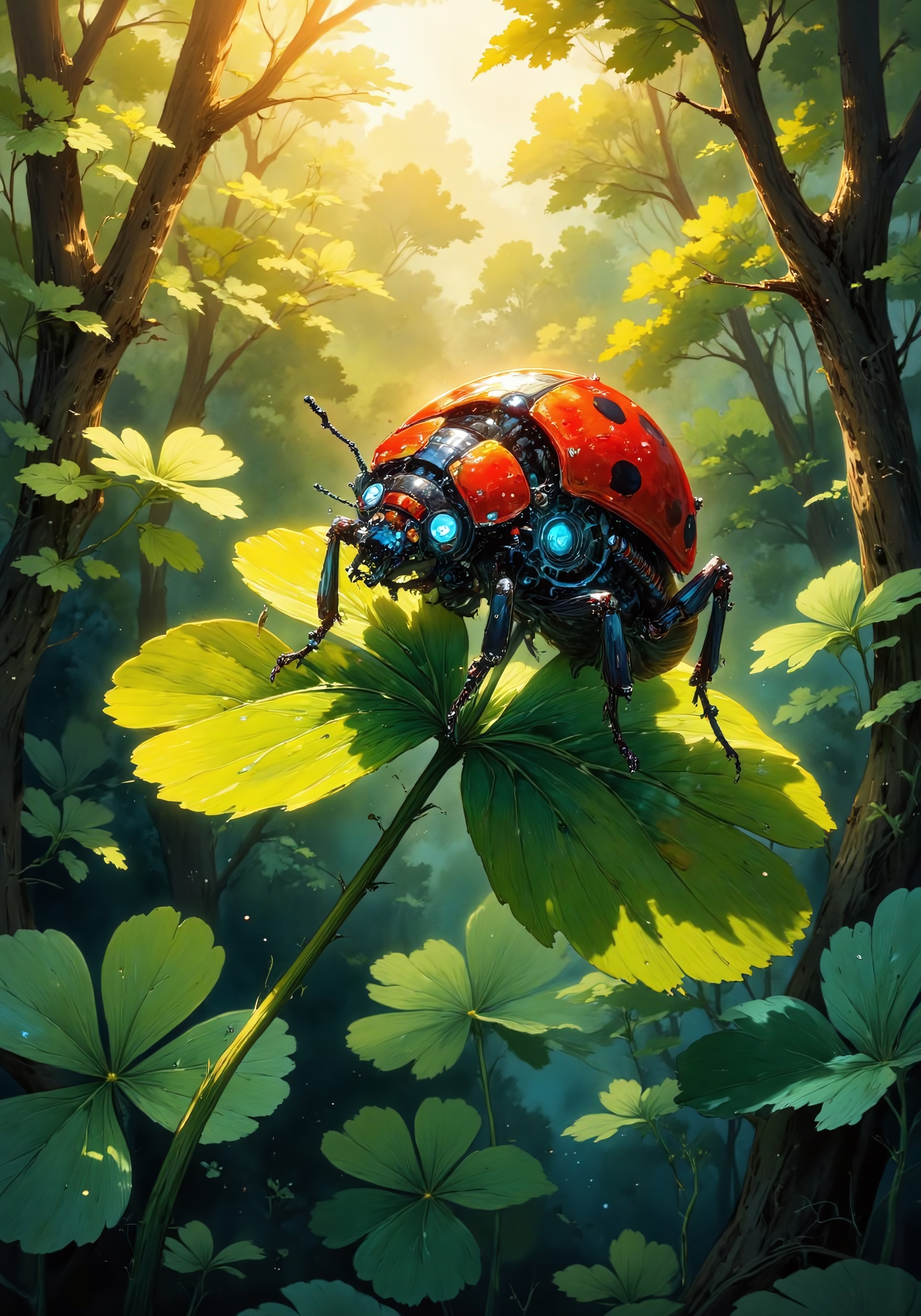 Masterpiece, best quality, Rim lit, painterly style, A robotic Ladybug made of intricate metallic structures and gears climbs on a giant clover leaf. Every part of the ladybug is mechanical and intricate technology. Each limb is made of minuscule intricate robotic parts, and its eyes glow with blue light. It's red shell is covered in hexagonal microchips. The antennae are wiry sensors. The atmosphere is cinematic and painterly, evoking a sense of nostalgia and adventure. Painterly, detailed, atmospheric. The colors are rich and vibrant, with crimson and green contrasts. Painted in an expressive impasto oil painting style, with thick, bold brushstrokes, a palette knife technique adding sculpted texture, and a painterly, post-impressionist aesthetic. The colors are rich and vibrant, with deep emeralds, golden sunlight, and earthy browns blending dynamically. The artwork has an organic, hand-painted feel, evoking warmth, nostalgia, and a touch of magic. Ultra-detailed, sharp image, rim lit, cinematic lighting, 8K resolution. DB4RZ, DB4RZ style painting, DarkAtmosCE style