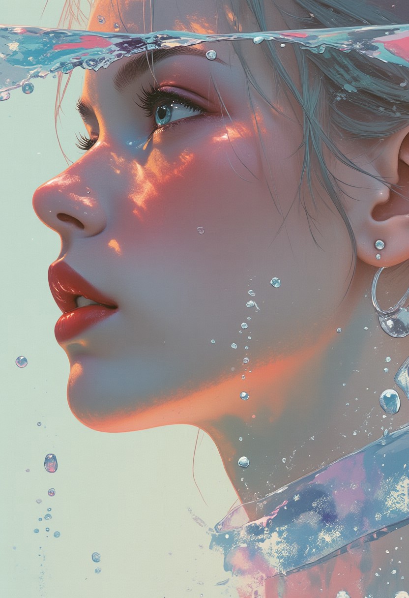 (ArsMJStyle, Colored pencil hyperdetailed realism, By Donna Young) A DSLR photo fashion-stylized dramatic, cinematic image in the aesthetic of vintagegirls, OBxiaoxiang, and Nova-70s. A high-resolution, hyperrealistic close-up of a woman's face partially submerged in water, taken from a low angle. It focuses on the upper portion, including her eyes, nose, and forehead. Her smooth, glistening skin reflects light, emphasizing wetness. The water forms dynamic ripples and bubbles, creating intricate fluid motion. Crystal-clear, it reveals her delicate facial features. She has fair, lightly tanned skin and striking blue eyes that contrast with the transparent water. A gradient background of light blue and white adds a serene, calming effect. The composition is mesmerizing and artistic, capturing water’s beauty and texture in extreme detail.