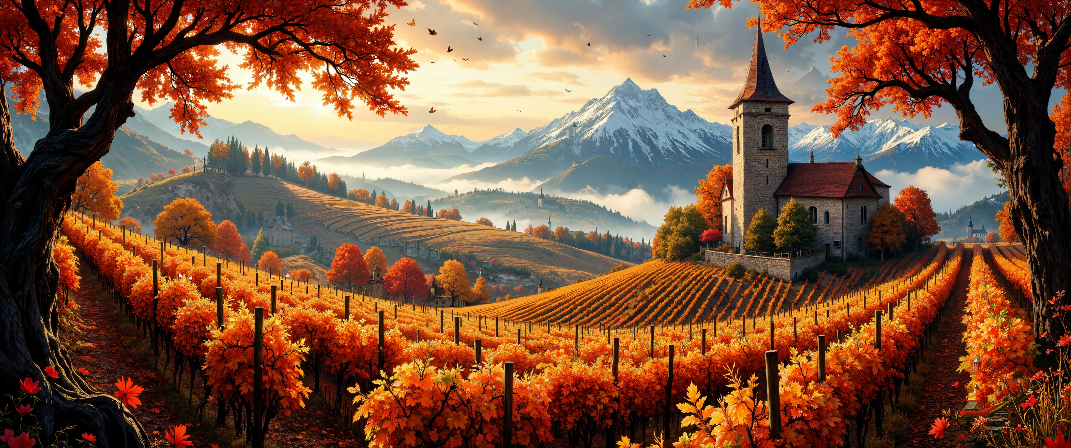 Breathtaking panorama of Slovenian autumn vineyard terraces, masterful oil painting style with rich impasto technique. Golden-red grapevines cascade down gentle hillsides of the Brda wine region near Italian border, morning mist lingering in valleys below. Medieval stone church steeple emerges through fog on distant hilltop. Dramatic October sunlight illuminates dewdrops on grape clusters, creating crystalline sparkle effect. Ancient oak trees with twisted trunks frame composition. Traditional wooden wine press visible in foreground, surrounded by slate-stone walls. Background features snow-dusted Julian Alps, their jagged silhouettes contrasting with rounded vineyard slopes. Photorealistic details of limestone soil, native butterflies hovering over wildflowers, and wooden vineyard markers. Atmospheric perspective capturing layers of hills fading into blue-purple haze. Hyper-detailed brushwork, 8K resolution, golden hour lighting, award-winning landscape photography inspiration. <lora:reedy-art-style:0.5> <lora:Memadukan_Brush_Strokes_of_Fineart:0.2> <lora:Rainbow_on_black_style-000003:0.5> <lora:flux_dev:1>