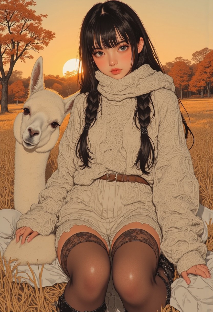 (**digital illustration**, **anime style**, **pingtu style**, **illustration-fen**, **niji**, **gothic**, **erotic**, **highly detailed**) featuring a (**young woman**:1.3) and an (**alpaca**:1.3). The (**woman**:1.3) has (**long black hair in two braids**:1.3), (**light brown skin**:1.3), and (**large blue eyes**:1.4). She wears a (**beige oversized knit sweater**:1.3), (**woolen shorts**:1.3), (**thigh-high stockings**:1.3), and (**fuzzy boots**:1.3). A (**fluffy scarf**:1.3) wraps around her neck, with (**gothic lace details**:1.3) adding a (**dark elegance**:1.3). The (**background**:1.2) is a (**tranquil autumn landscape**:1.3) with (**golden fields**:1.3), (**amber trees**:1.3), and a (**pastel orange sky**:1.3) at (**sunset**:1.3). The (**alpaca**:1.4) has (**cream-colored fur**:1.4) and a (**gentle expression**:1.3), blending with the (**earth-toned**:1.3) setting. The (**warm color palette**:1.3) features (**beige, gold, and brown hues**:1.3) with (**sharp lines**:1.3) and (**smooth shading**:1.3), enhancing the (**high-quality digital art**:1.3). The (**mood**:1.3) is (**serene**:1.3, **cozy**:1.3, **sensual**:1.3), blending (**fashion**:1.3), (**nature**:1.3), and (**subtle eroticism**:1.3) within a (**gothic-inspired anime aesthetic**:1.3).