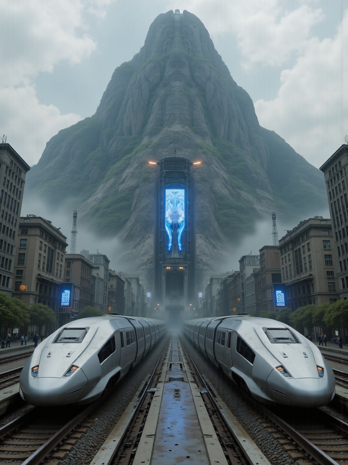 ultra detailed masterpiece showing high speed trains on monorails with blue lights lead to the city and come from a tunel in a big mountain in the distance there is a robot. the woman is a female high-tech robot with lots of cables, wires and led. stylehghtc highly detailed perfect composition ultra detailed cinematic film still <lora:hghtc_rank32_bf16-step03000:0.8> <lora:LowAngleViewFLUX-000001:0.8>