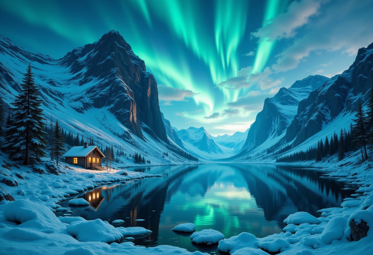 A breathtaking landscape, blending the stark, awe-inspiring scale of Nordic Romanticism with the delicate composition of Albert Bierstadti with the luminous brushwork of Henry Daubrez. In the background, a glacial fjord rises sharply, its icy cliffs glowing turquoise under the shimmering Northern Lights. The aurora dances in ribbons of emerald and violet, mirrored perfectly in the still, obsidian-black waters below. A lone wooden fishing hut, illuminated by warm amber light, nestles at the fjord’s edge, contrasting the cold vastness. The foreground features frost-covered pines and jagged ice formations, rendered with crystalline detail. Bierstadt’s soft, glowing light blends with the Romanticists’ dramatic contrasts, creating a scene that feels both epic and intimate. The palette merges arctic blues and silvers with pockets of warm ochre and auroral hues. Rendered in 8K resolution, featuring hyper-detailed ice textures, celestial luminosity, and a hauntingly tranquil mood, DB4RZ, DB4RZ style painting, aidmafluxproultra, aidmaimageupgrader