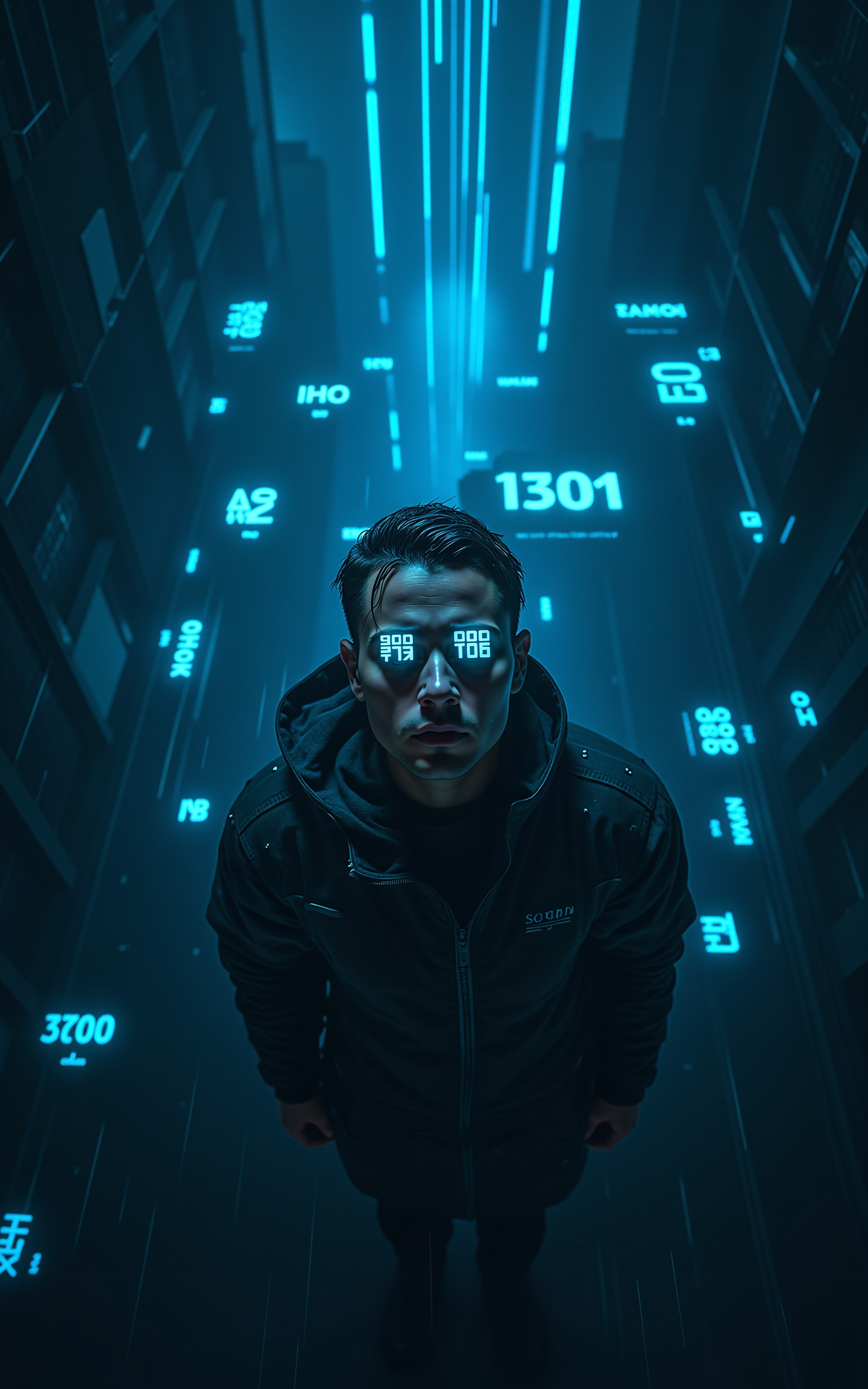 A top-down view of a scientist standing in the rain,looking up at the camera. Raindrops stream down his face as his eyes reflect flowing data streams. Countless floating numbers and codes fill the air,forming a holographic digital web. Neon blue lights flicker through the rain,creating a futuristic cyberpunk atmosphere.,<lora:kcyberpunk-02:0.6>,kcyberpunk,