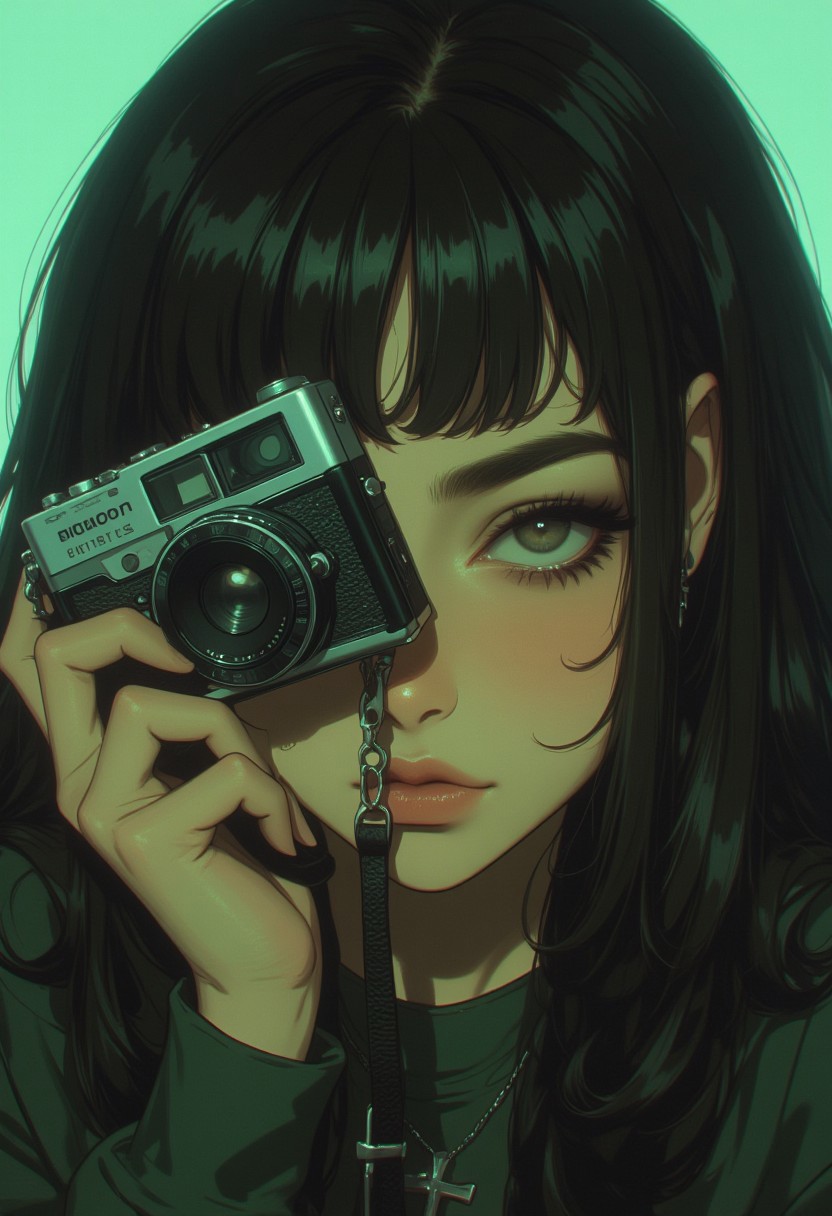 The image shows a young woman with long, dark hair, holding a vintage camera that partially covers one eye. Her intense gaze, framed by dark eyebrows, adds to the introspective mood. Soft lighting, grainy texture, and subtle color grading give the photo a nostalgic, film-like quality. The vintage camera, silver and black, catches the light and suggests familiarity. Loose hair strands and a slightly off-center face highlight her sharp features. The camera partially obscures her left eye, creating an artistic interplay. Soft lighting and muted tones, including greens, blues, and sepia, enhance the vintage ambiance. A light leak effect adds warm hues. The blurred background focuses attention on her face and camera. The image evokes introspection and nostalgia, with the vintage camera symbolizing memory and storytelling. Grain and light leaks contribute to the dreamlike atmosphere, making it feel like a memory frozen in time. The subject's calm expression and direct gaze create an intimate connection with the viewer. The photograph blends portraiture and artistic storytelling, creating a timeless and emotionally resonant image of personal reflection, photography, and capturing moments that feel both contemporary and nostalgic.