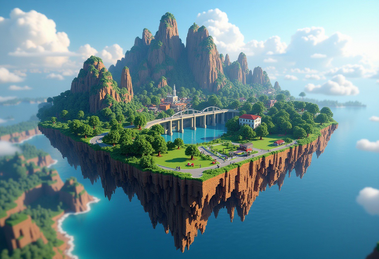 An ultra high definition photograph render of an unrooted minecraft style world, floating above the ground. world consists of mountains, city, bridges, ocean, trees, park, cars, people, and powerlines. extreme detail, dynamic angles, realistic textures and colors, depth of field, 8k masterpiece.