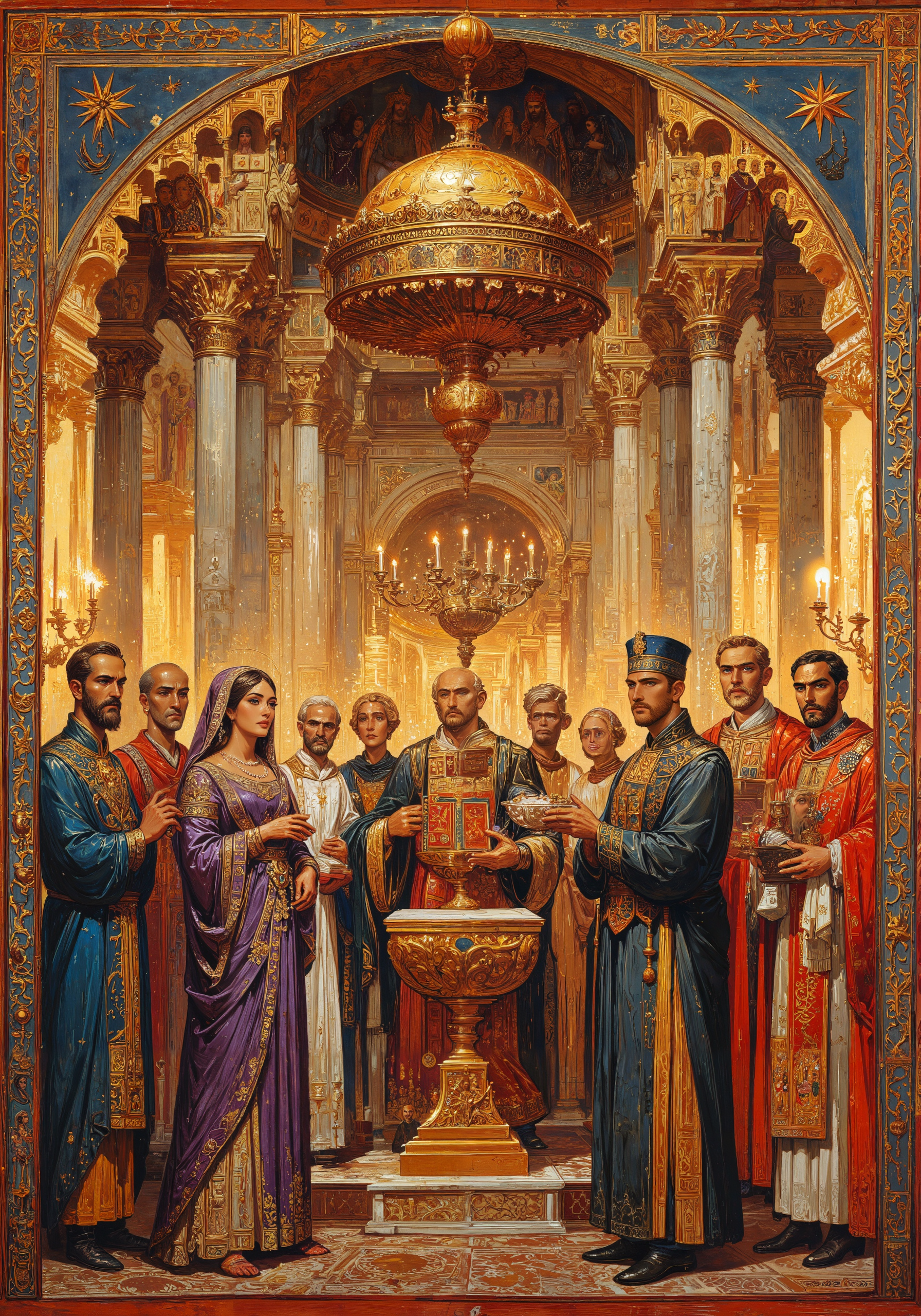Byzantine fresco depicting a royal wedding ceremony inside Hagia Sophia, with imperial couple standing beneath golden ciborium. Bride in ornate purple silk with pearl-embroidered loros, groom in ceremonial military attire adorned with gemstones. Patriarch performing blessing with jeweled Gospel book, surrounded by deacons holding ornate silver censers. Background features flattened architectural perspective with alabaster columns, intricate floor mosaics, and hanging polycandela. Attendants in hierarchical arrangement according to court rank. Rich ochre and vermilion pigments, distinctive nimbus halos around principal figures. Stylized faces with almond-shaped eyes and elongated noses. Margins decorated with geometric interlace patterns and acanthus motifs. Candlelight illuminating gold leaf details, somber atmosphere filled with mystical solemnity. Masterpiece of Komnenian period iconography with meticulous attention to liturgical accuracy. <lora:Organic Sauce - FLUX:0.6> <lora:FLUX-daubrez-DB4RZ:0.2> <lora:aidmaMJ6.1-FLUX-v0.4:0.8> <lora:FluxMythG0thicL1nes:0.4> <lora:flux_dev:1>