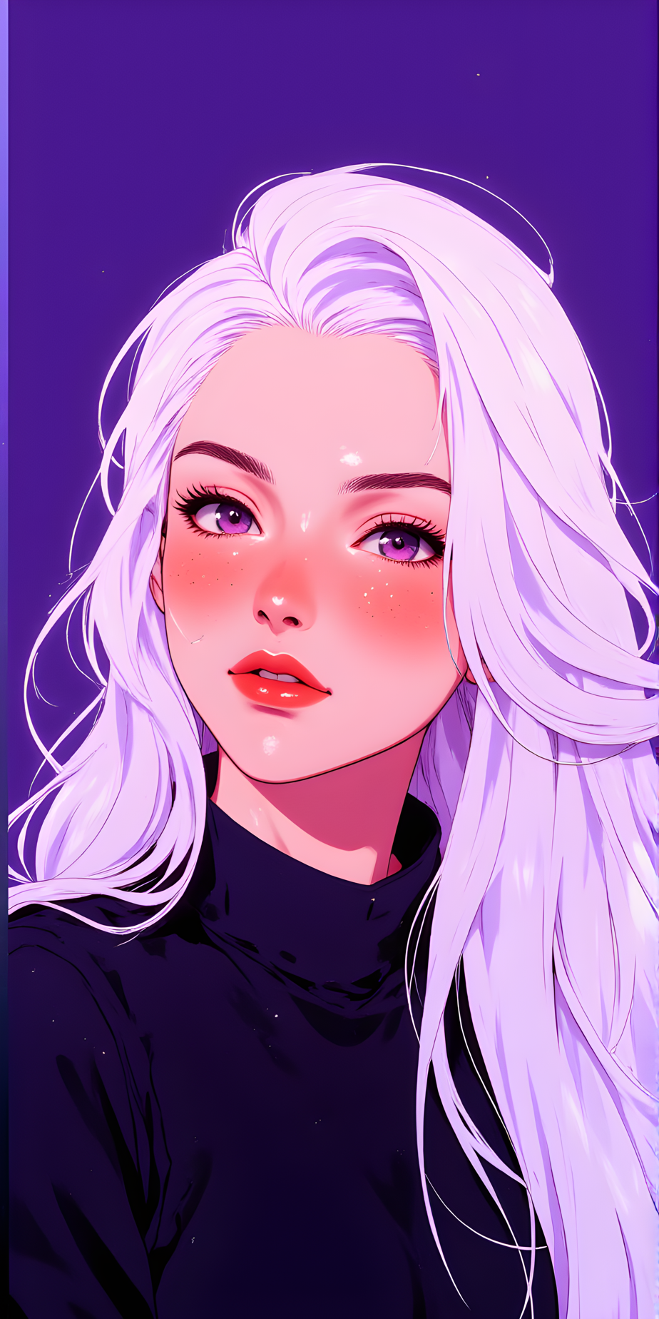 The image features a striking portrait of a person with long, flowing white hair that cascades over their shoulders. The individual has captivating purple eyes and fair skin, with subtle freckles adding a touch of natural charm. Their expression is calm and composed, with a slight tilt to their head, giving an air of confidence and poise. They are wearing a dark, high-necked top that contrasts beautifully with the vibrant purple background, which enhances the ethereal quality of the scene. The overall composition is elegant and modern, with a focus on the serene and radiant appearance of the subject. j_art, anime, anime art, <lora:FLUX\jul\J_Anime:0.7>, <lora:FLUX\RealAnime:0.7>