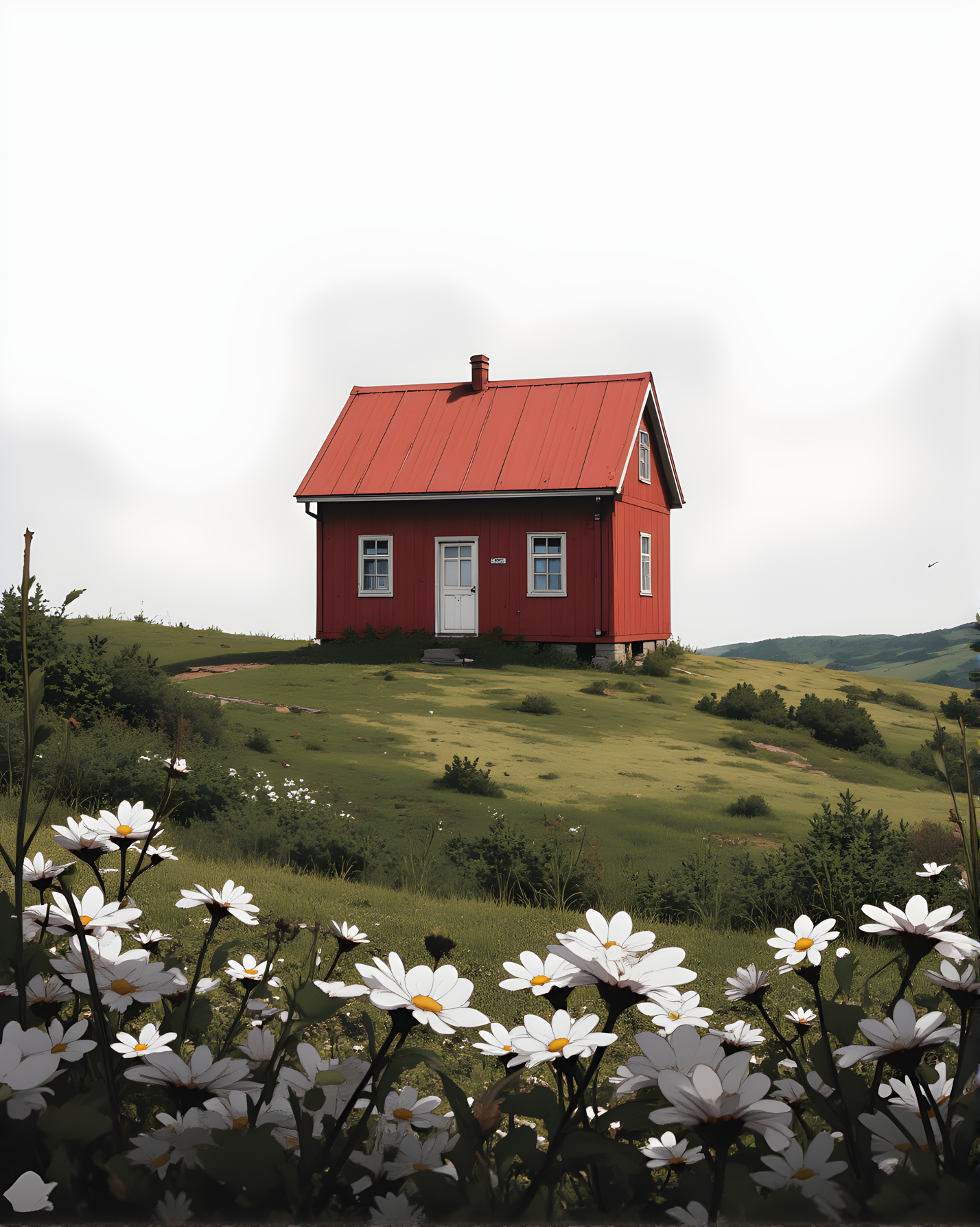 The image depicts a serene and picturesque rural scene featuring a small, vibrant red house situated on a grassy hill. The house has a steep, reddish-brown roof and white-framed windows, giving it a quaint and charming appearance. The surrounding landscape is lush with green grass, creating a soft, rolling backdrop that enhances the peaceful atmosphere. In the foreground, delicate white flowers add a touch of natural beauty, framing the scene beautifully. The overall setting exudes simplicity and tranquility, capturing the essence of a quiet countryside environment. j_art, anime, anime art, <lora:FLUX\jul\J_Anime:0.7>, <lora:FLUX\RealAnime:0.7>