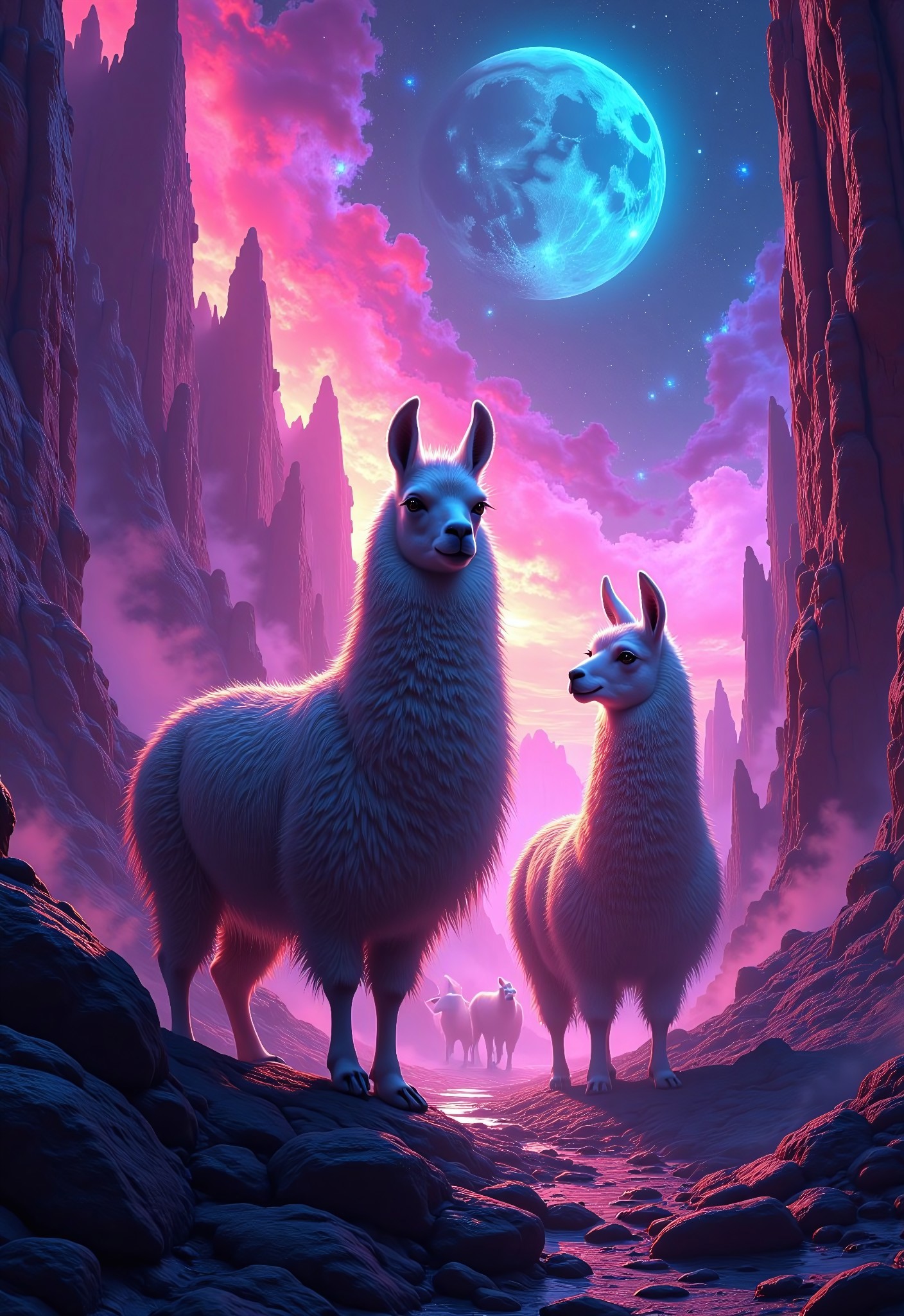 aidmaimageupgrader, a high quality digital Synthwave styled image of Metagalactic Llamas Battle at the Edge of Time