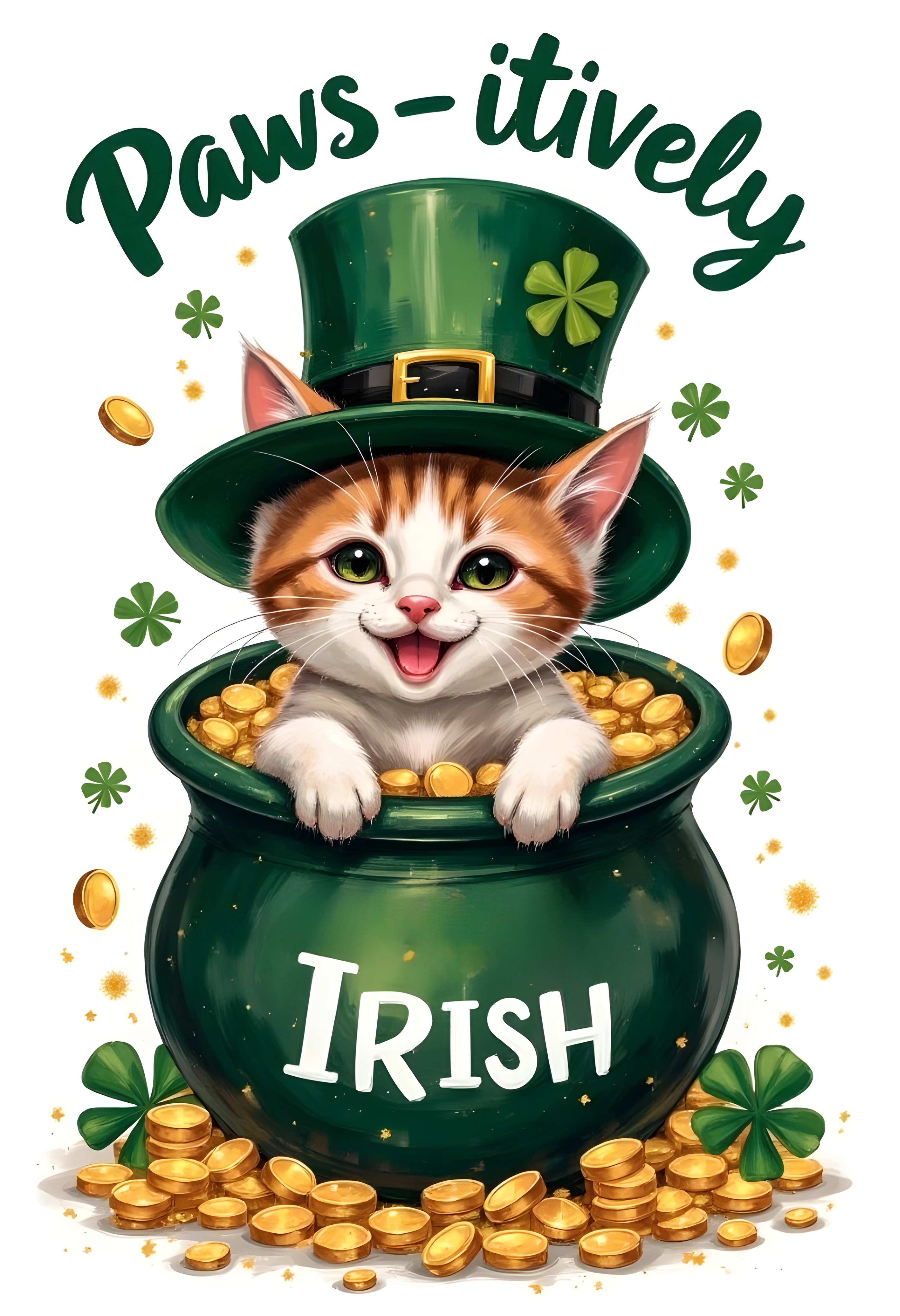 cinna flow, An adorable kitten wearing a leprechaun hat and sitting inside a pot of gold. The phrase ‘Paws-itively Irish’ is written in a fun, bouncy font with little paw prints surrounding it.