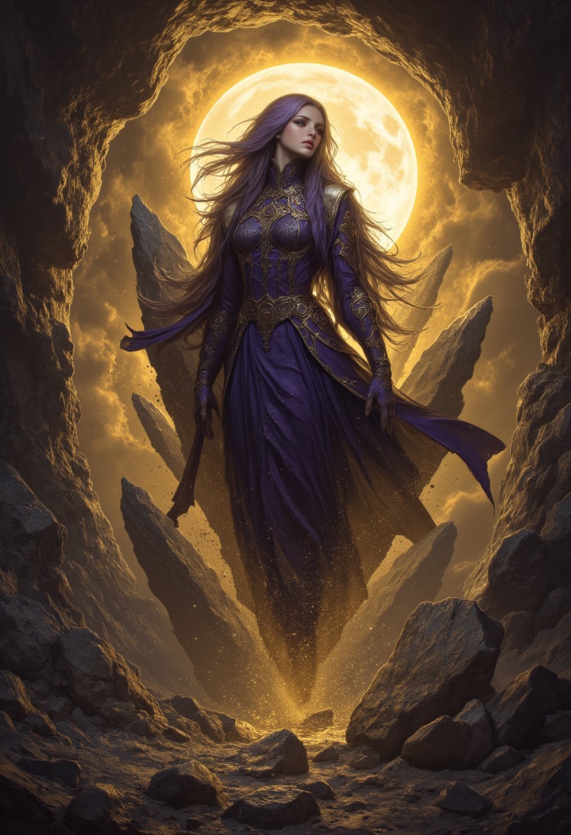 "Noctessa," the first goddess, rising from the ruins of forgotten creation, erased from time but never truly gone, hyperdetailed, 8k resolution concept art, WLOP, Moebius, Royo, celestial rebirth, divine ruins crumbling, golden dust swirling in the void. She should not exist. But in the hollow space where light dies and the underworld breathes its first exhale, something stirs. The ground fractures, ancient symbols long buried beneath the bones of Olympus breaking open like shattered glass. A deep, resonant hum shakes the void as golden dust spirals into the air, coiling into something tangible, alive, inevitable. From the abyss, she rises. Noctessa’s form is forged from the remnants of creation itself, her skin luminous with the last glow of a dying sun, her violet-black hair shifting between shadow and mist, woven from the very fabric of night itself. As she ascends, the fragments of her lost kingdom lift around her—crumbling temples, shattered celestial thrones, the remnants of an empire stolen from her. Her eyes, once veiled in forgetfulness, snap open—twin galaxies burning with the knowledge of what has been done. The gods buried her. They took her name, her throne, her story. But Noctessa remembers now. And the heavens will tremble at her return.