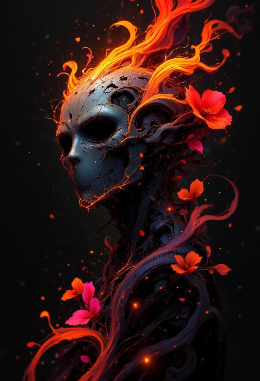 A digital painting in a dark, moody style. The color palette is primarily dark grays, blacks, and oranges, with oranges used as highlights. Strong contrasts between light and shadow create dramatic lighting. Visible brushstrokes and a textured surface contribute to the painterly, expressive style. The overall effect is gritty, intense, and slightly abstract. A dark gray, polished stone or metal skull, in profile view facing right, is partially submerged in swirling dark and orange paint or ink. The paint ranges from deep oranges and reds to dark browns and blacks, creating a smoky, fluid effect. Translucent orange, red, and pink stylized flower petals are scattered throughout the paint. Small speckled dots of orange and white are present. The skull's smooth surface contrasts with the swirling, textured paint and delicate petals. The background is dark, allowing the vibrant colors to stand out.