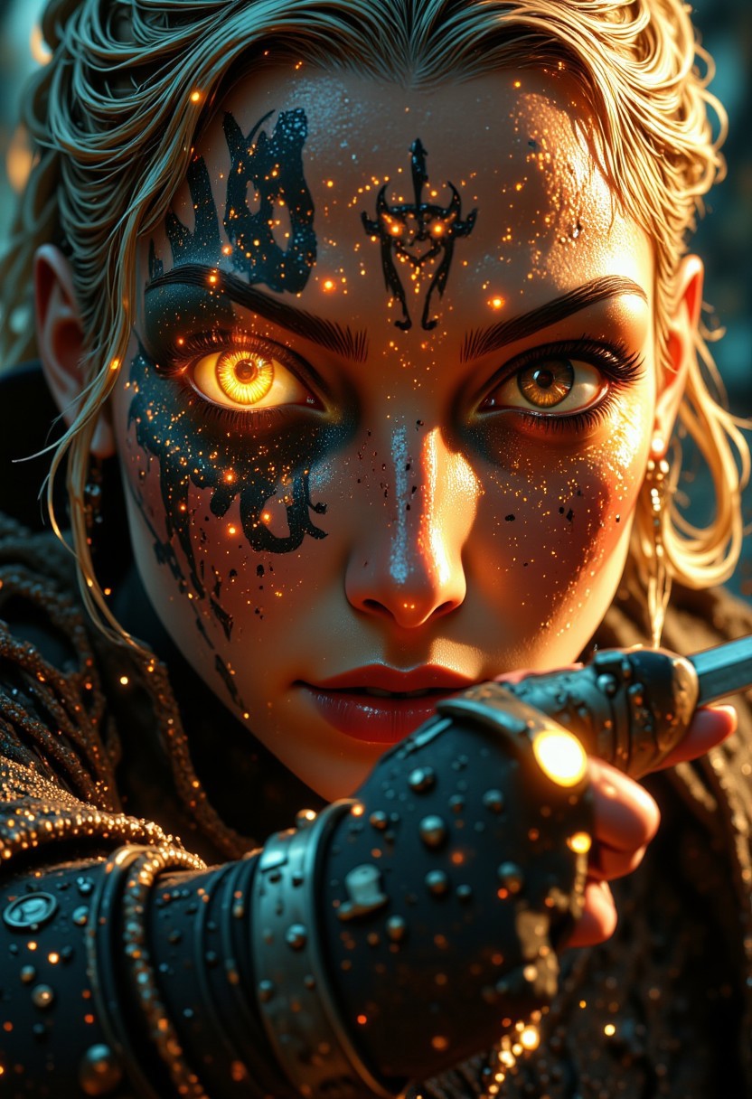 Anime, closeup portrait, photograph, Fierce blonde female warrior is holding a longsword in front of her face covering one eye, ancient runes glowing all over her face and her longsword, mad-arcnsmbls, MurphFSF, FSF-Real-Babes
