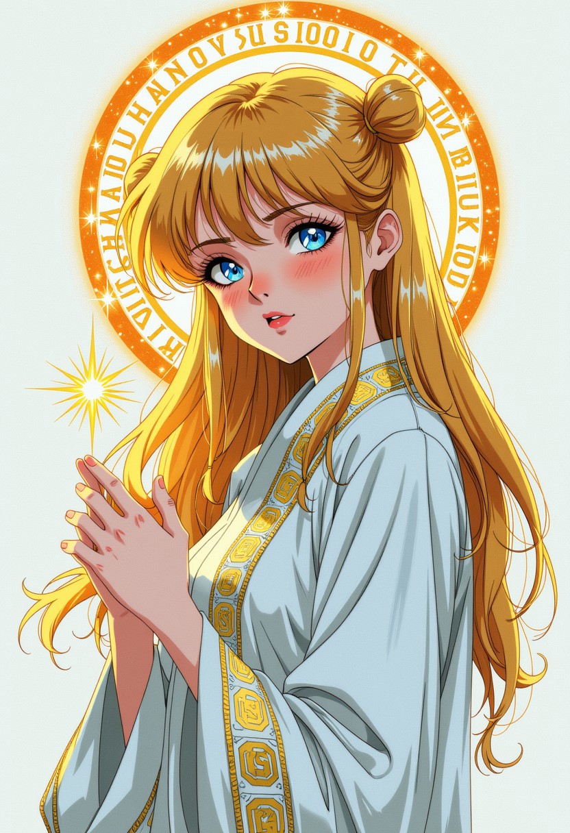 modernretroanime. A captivating retro anime portrait of a women looking at the camera with a coy expression, embodying a mystical and ethereal vibe. Her blonde hair cascades with long locks, styled with bangs and thin side braids, adorned with hair buns. Her eyes are a striking bright ice blue, accentuating her pale skin and the soft blush on her cheeks. She wears a flowing white robe, intricately designed with glowing Norse runes, adding to her divine appearance. A circle of golden Norse runes glows around her, and she is surrounded by a glowing magical aura, emitting sparks. The background is a pure white canvas, highlighting her ethereal presence. The painting has a loose watercolor and ink texture, resembling an abstract expressionist style with influences of Rockwell, Vallejo, and Royo, blended with cinematic double exposure and high contrast. The painting exhibits translucent layers of ink and watercolor, delicate brushstrokes, and cinematic light and shadow play, creating a dynamic, ethereal atmosphere. The overall tone mixes soft pastel colors with deep contrasts, while the subject’s detailed eyes and divine aura make the image both intimate and artistic. The work includes a sophisticated mixture of magical, divine, and dynamic visual elements, evoking a surreal, spellbinding mood.