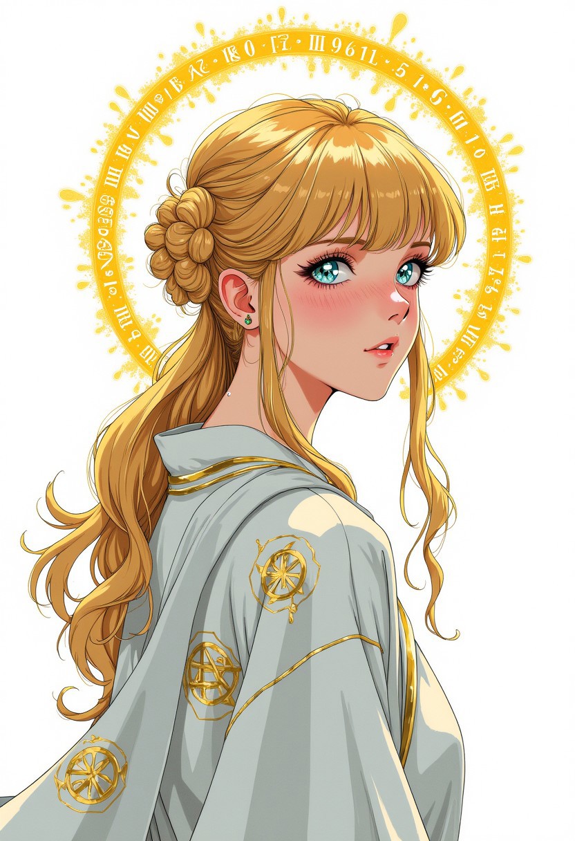 modernretroanime. A captivating retro anime portrait of a women looking at the camera with a coy expression, embodying a mystical and ethereal vibe. Her blonde hair cascades with long locks, styled with bangs and thin side braids, adorned with hair buns. Her eyes are a striking bright ice blue, accentuating her pale skin and the soft blush on her cheeks. She wears a flowing white robe, intricately designed with glowing Norse runes, adding to her divine appearance. A circle of golden Norse runes glows around her, and she is surrounded by a glowing magical aura, emitting sparks. The background is a pure white canvas, highlighting her ethereal presence. The painting has a loose watercolor and ink texture, resembling an abstract expressionist style with influences of Rockwell, Vallejo, and Royo, blended with cinematic double exposure and high contrast. The painting exhibits translucent layers of ink and watercolor, delicate brushstrokes, and cinematic light and shadow play, creating a dynamic, ethereal atmosphere. The overall tone mixes soft pastel colors with deep contrasts, while the subject’s detailed eyes and divine aura make the image both intimate and artistic. The work includes a sophisticated mixture of magical, divine, and dynamic visual elements, evoking a surreal, spellbinding mood.
