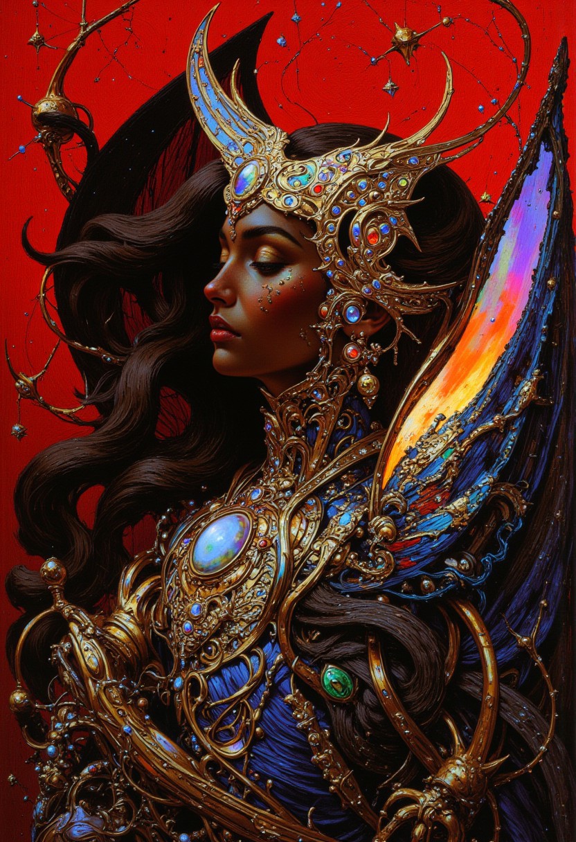 ((highly detailed oil painting:1.3) (inspired by ((Egon Schiele:1.3) (expressive distortions:1.3)) and ((Alphonse Mucha:1.3) (flowing elegance:1.3)))): A young woman with rich, dark skin and flowing deep auburn hair. Her serene yet enigmatic expression is enhanced by a subtle pout. She wears an opulent, avant-garde ensemble in deep sapphire blue with shimmering gold and iridescent emerald accents, creating a luminous, liquid effect. The shoulders of her garment feature intricate, wing-like structures, blending armor and butterfly wings with reflective metallic surfaces. She is adorned with a striking, star-shaped hair ornament on the left side of her head, set with a glowing gemstone shifting between violet and fiery orange. Large, ornate earrings echo the gemstone’s colors, adding celestial elegance. The background is bold crimson red, textured with expressive brushstrokes and delicate gold leaf detailing, capturing Mucha’s flowing elegance and Schiele’s raw intensity. Ethereal, glowing constellations and swirling light patterns emerge subtly, enhancing the dreamlike atmosphere. The expressive style, with exaggerated contours and dynamic textures, blends Art Nouveau’s intricate beauty with Expressionism’s emotional distortions. Light, texture, and vibrant color create a hypnotic, timeless presence.