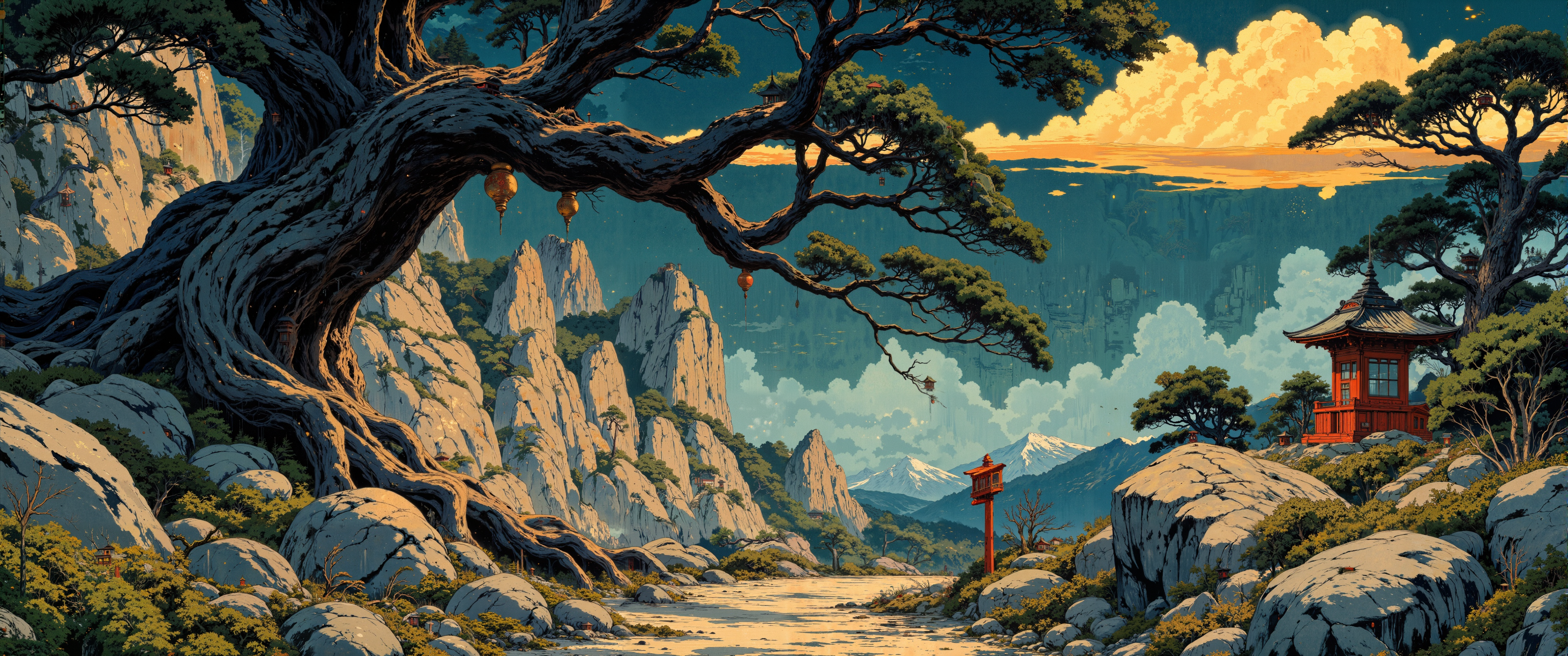 A secluded mountain pine grove captured in vibrant nihonga style, featuring ancient twisted black pines clinging to weathered granite outcroppings. Asymmetrical composition with delicate golden cloud patterns adorning indigo mineral pigment skies. Miniature red-lacquered shrine nestled among moss-covered boulders, partially obscured by hanging pine needles. Ethereal morning light filters through pine branches, creating dappled shadows across a meandering pebble path. Small copper wind bells hanging from lower branches catch early light with subtle gleam. Traditional tarashikomi technique creates elegant pooling effects where mountain mist meets stone. Intimate sense of ma throughout the composition, balancing emptiness with detailed pine textures. Subtle seasonal indicators of early winter â scattered pine cones and first frost rimming stone edges. Master-level brushwork capturing pine bark textures with exceptional detail. Palette of forest greens, stone grays, amber, and touches of vermilion, all rendered with natural mineral pigments on textured washi paper. <lora:flux.1_lora_flyway_Epic-detail_v2:0.4> <lora:RM_Animefy_v1.0M:0.5> <lora:Fancha_style_v.5:0.4> <lora:MysticFantasy:0.3> <lora:flux_dev:1>