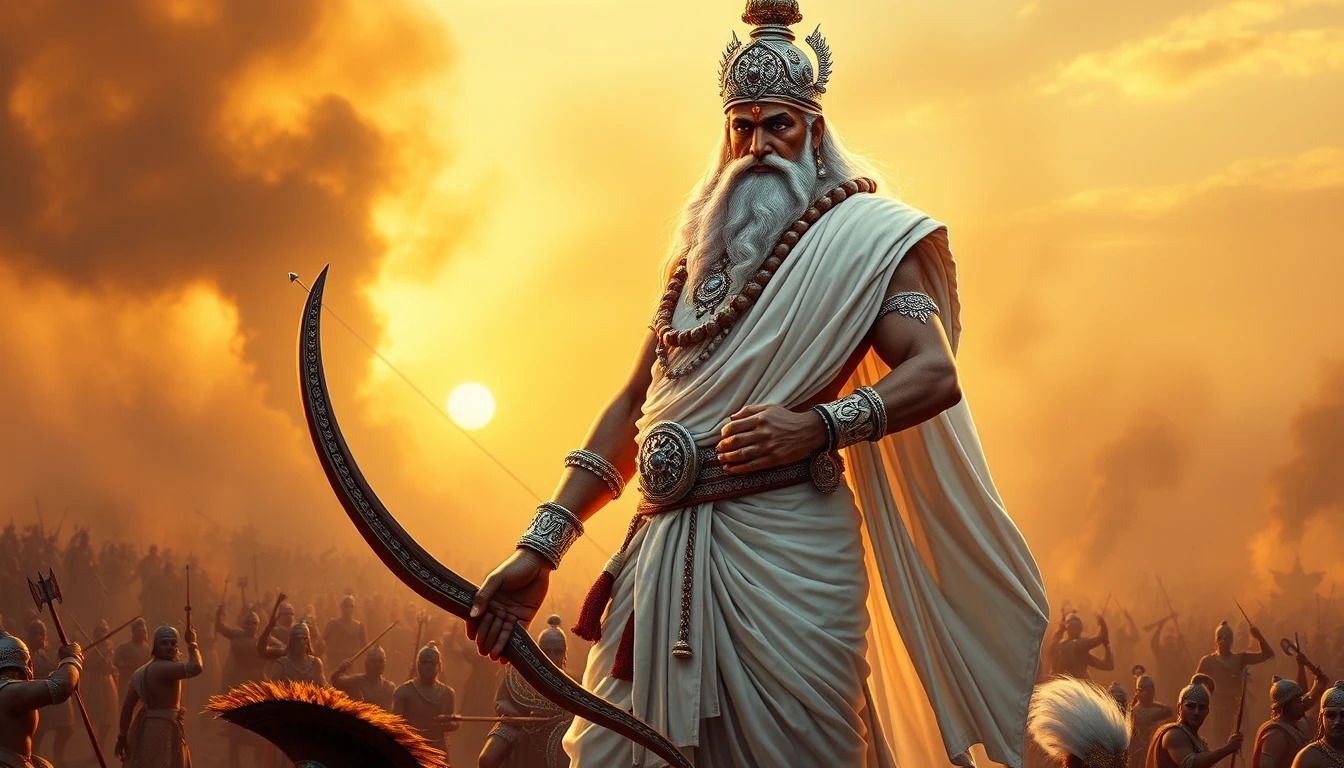 "Bhishma Pitamah, the grandsire of Hastinapur, stands tall and majestic on the battlefield of Kurukshetra, embodying the essence of a warrior and a wise leader. His towering figure is clad in pure white attire—a flowing white dhoti and angavastram, symbolizing his purity and detachment. His white crown, intricately designed with silver motifs and gemstones, rests firmly on his head, adding to his regal aura. His long white beard and hair flow gracefully, symbolizing his age, wisdom, and experience. His face is calm yet commanding, with sharp features and piercing eyes that reflect his strategic mind and unwavering resolve. In his hand, he holds a massive bow, its string taut and ready, while a quiver of arrows is slung over his shoulder. His posture is upright and powerful, exuding strength and authority. The backdrop is the grand battlefield of Kurukshetra, with dust and smoke rising in the distance. The golden light of the setting sun bathes the scene, casting long shadows and highlighting Bhishma’s figure. The textures are 12K Ultra-HD, capturing every detail: The intricate carvings on his white crown, the folds of his white attire, and the gleam of his weapons. The dust and smoke in the air, the distant clash of armies, and the fluttering war flags. The polished ground reflecting the sunlight, creating a soft, cinematic glow. The camera angle is slightly low, giving a grand and cinematic feel to the scene. The depth of field is shallow, focusing sharply on Bhishma while softly blurring the background, adding a filmic quality. This is a 12K Ultra-HD cinematic portrayal of Bhishma Pitamah, capturing his strength, wisdom, and the emotional weight of his role as the protector of Hastinapur in stunning detail."