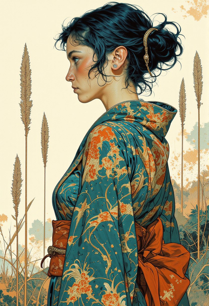 (highly detailed:1.3, hyper-realistic:1.3, digital artwork:1.3) This is a highly detailed digital illustration featuring a young woman depicted in profile, facing left. She has a short, sleek bob in deep midnight blue with subtle highlights, framing her serene, contemplative expression. Her eyes are a soft amber hue, and her fair skin has a gentle luminescence. She wears a traditional Japanese kimono with intricate, abstract patterns in rich sapphire, burnt orange, jade green, deep crimson, and hints of silver, evoking a sense of history and artistry. The fabric's texture appears slightly aged, with areas of fading adding depth and realism. The background is an off-white canvas with subtle, expressive brush strokes and splashes of color, creating a soft contrast. Surrounding her are tall, abstracted plants and grasses in earthy browns, olive greens, and hints of gold, suggesting a tranquil natural environment. The composition is harmonious, with the woman's figure central and dominant, while the background elements remain abstract and complementary. The illustration blends smooth gradients with textured patterns, emphasizing the intricate details of the kimono while maintaining a minimalist aesthetic in the background. The overall mood is one of quiet sophistication and elegance.
