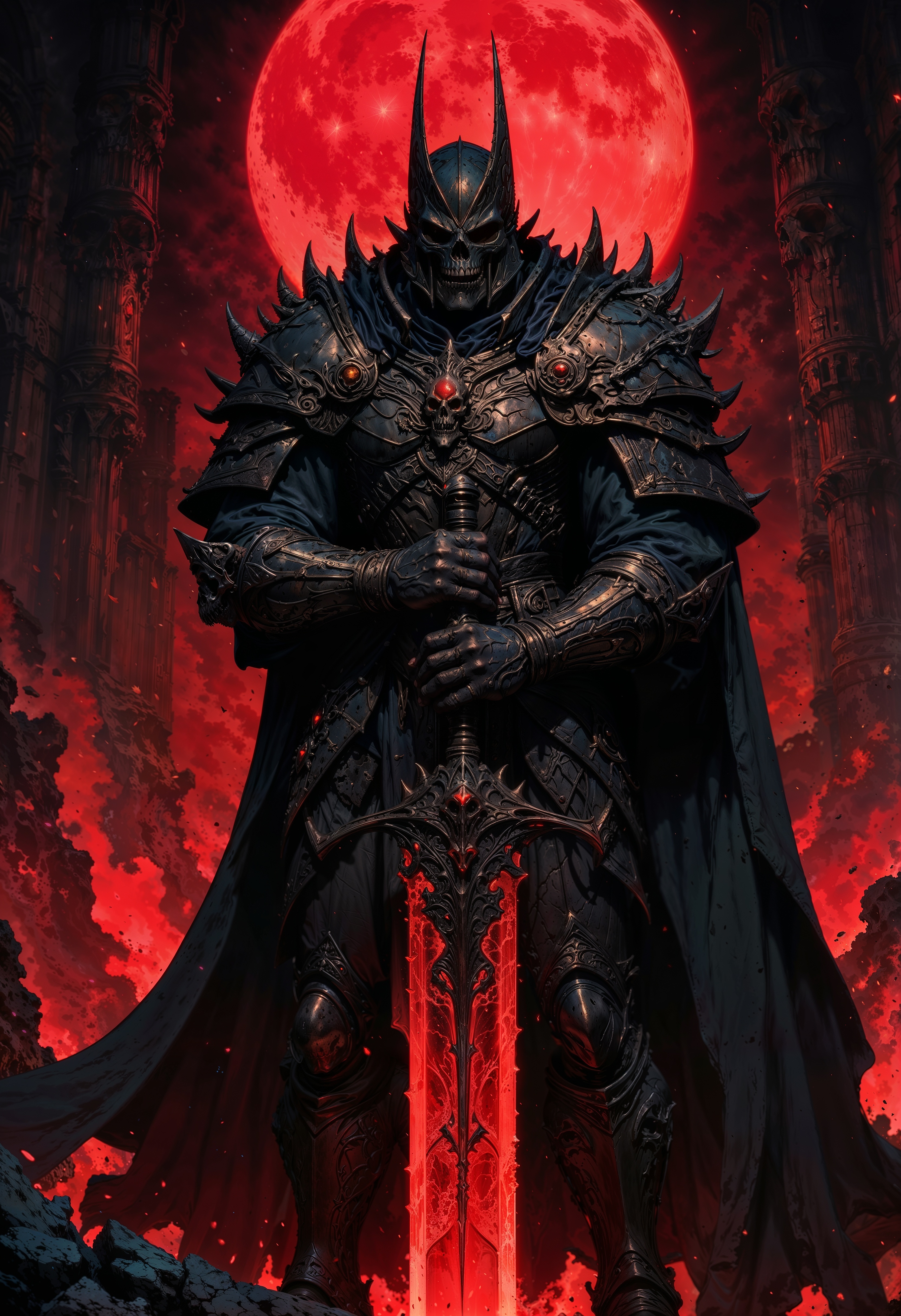 a dark, fantasy-themed style. The layout is vertical, dominated by a central figure clad in intricate, spiked armor, holding a large, ornate sword. The figure's face is obscured by a skull-like helmet, adding to the menacing appearance. The armor is detailed with sharp edges and dark metallic hues. The sword is massive, with a glowing red blade that matches the fiery red moon in the background, casting an ominous glow over the scene. The background is filled with swirling dark shadows and red embers, enhancing the dramatic and intense atmosphere. The overall color palette is dominated by deep blacks and vibrant reds, creating a stark contrast that emphasizes the dark fantasy theme.