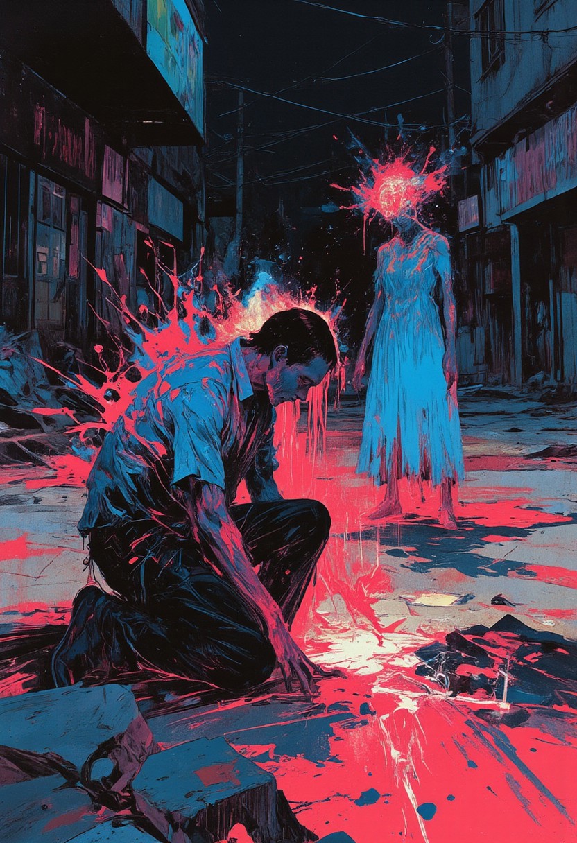 apoca1 illustration. 2 people. A man with a broken heart is on his knees, hands on the floor. The man is desperate and ready to cry. The figure of a distant woman from the back. She is wearing a blue dress. Her hair is developing. Vibrant hues of red and blue shimmer with stars and galaxies. Symbolism of lost love, longing, despair and loneliness. pink_glow. The background features dim city side street. evoking a sense of despair and loneliness.