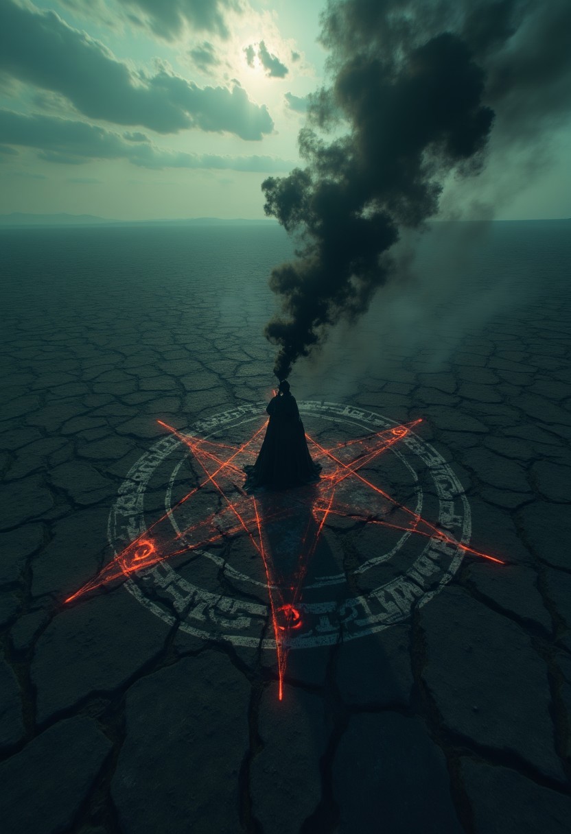 A dramatic fish-eye aerial perspective of a dark, shadowy figure being summoned within a massive, glowing black smoky pentagram. The scene is set in a desolate, otherworldly landscape, with the pentagram etched into cracked, ancient stone ground. Thick, swirling smoke rises from the edges of the pentagram, blending into the dark, stormy sky above. The shadowy figure emerges from the center, its form shifting and undefined, exuding an aura of malevolence and power. The dark theme is intensified by the muted color palette—deep blacks, grays, and faint hints of blood red glowing within the pentagram’s lines. The fish-eye lens distorts the edges of the scene, emphasizing the scale and intensity of the summoning. The atmosphere is heavy and ominous, with faint, eerie light breaking through the clouds, casting long, distorted shadows across the ground. Intricate details include the texture of the cracked stone, the swirling smoke, and the faint, glowing runes scattered around the pentagram. The overall mood is one of dread and foreboding, capturing the moment of a dark, otherworldly force being unleashed."