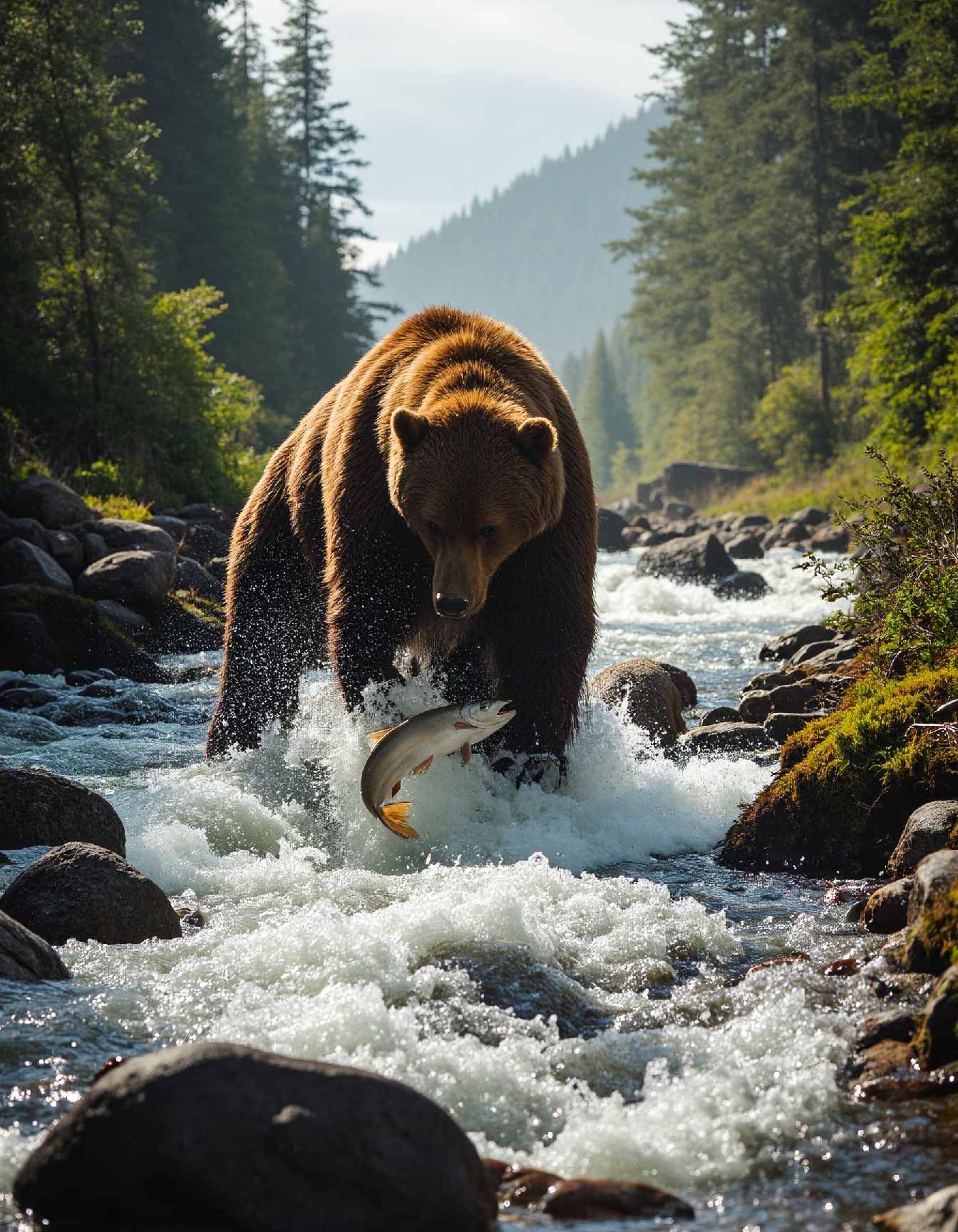 cinematic, photorealistic, Massive grizzly bear swoops in with claws extended, snatching silver trout right from swirling waters of rugged mountain stream. Bear's fur ripples under misty rainforest canopy; water droplets sparkle on thick coat. Trout leaps high into air before being pulled back down; bubbles rise rapidly. Sunlight filters through dense foliage, casting dappled light on wet earth and rocks lining riverbanks. Beavers swim quietly in background; ferns and moss-covered trees frame scene.
