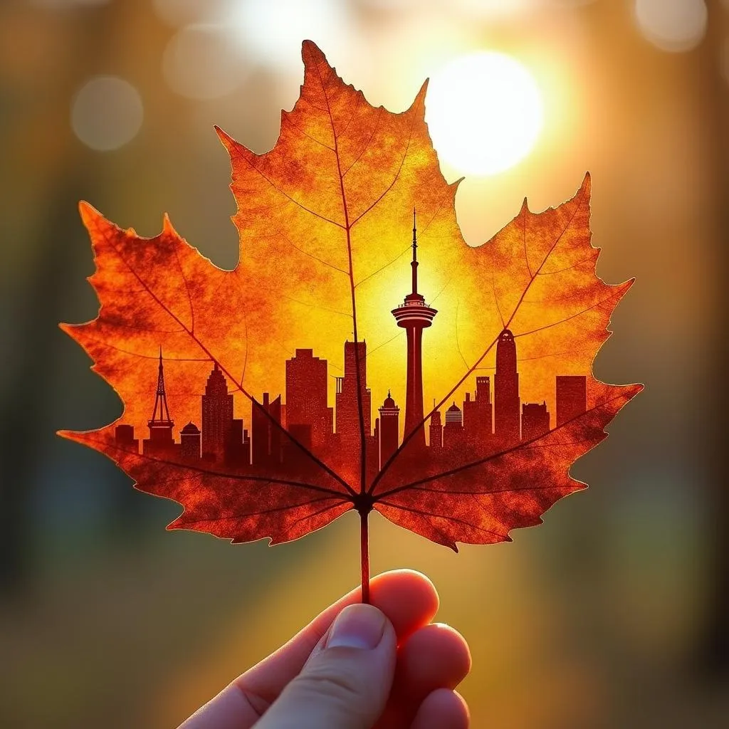 Vibrant, highly detailed close-up of a singular autumn leaf, its translucent surface revealing an intricate miniature landscape of tooronto s landmarks with delicate brushstrokes reminiscent of the Old Masters, as if the leaf itself were a canvas. Into this tiny world,The image should evoke the warmth and depth of a sunlit landscape, with a shallow depth of field drawing the viewer's eye into the heart of the sheet. The color palette should be rich and vivid, with bold, expressive strokes of burnt orange, cadmium yellow, and crimson, mixed with the soft golden light of an autumn afternoon, all on a subtle, grainy texture reminiscent of handmade paper.