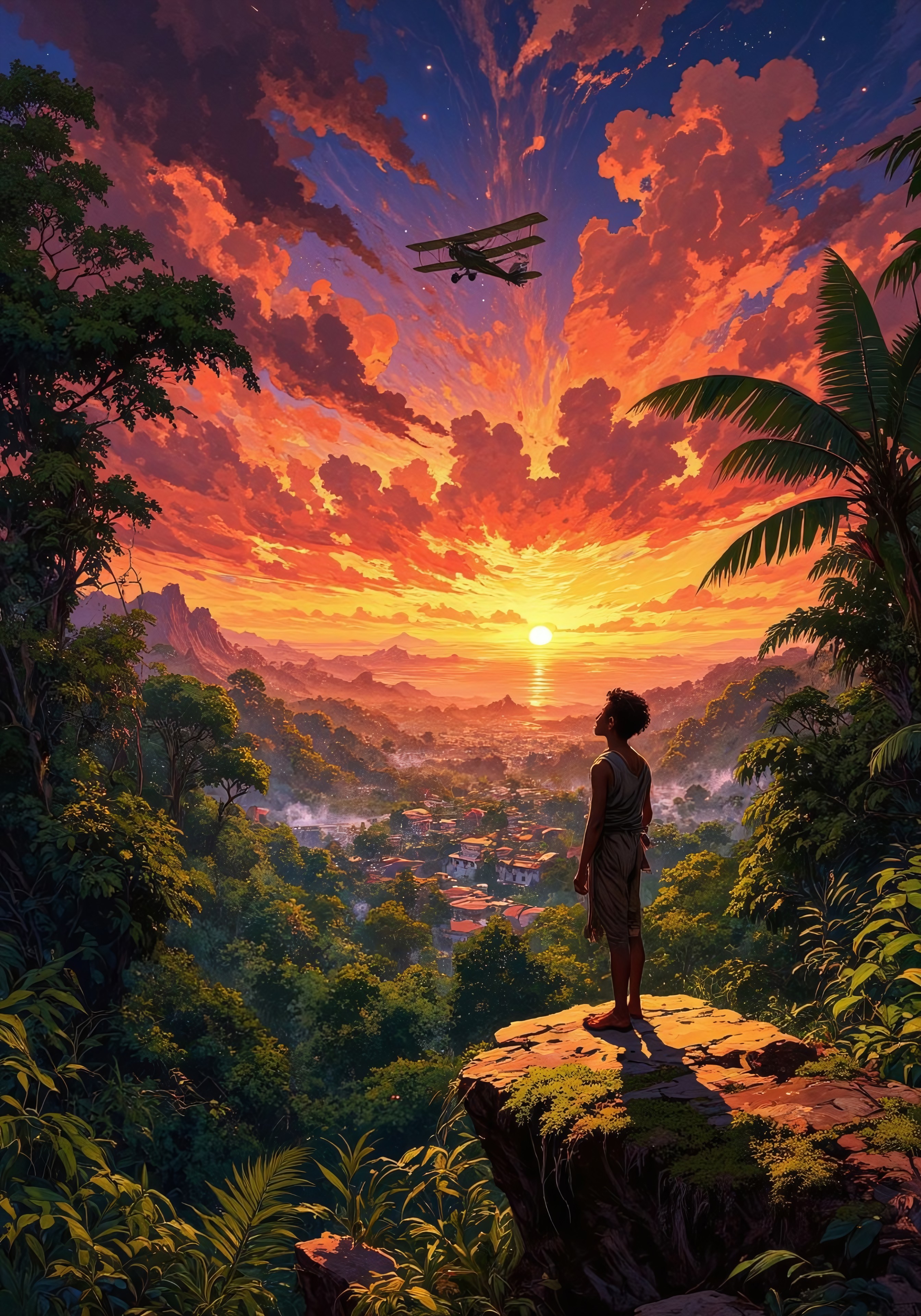 Masterpiece, best quality. An evening in the dense jungle, where the golden sun sinks toward the horizon, painting the sky in fiery streaks of crimson, tangerine, and violet. A lone villager in simple earth-toned garments stands atop a moss-covered outcrop, gazing skyward in awe. Above in the distance, far away in the sky, a vingtage 1930s biplane soars low over the jungle canopy. The lush jungle hums with life, fireflies rising like drifting embers, and the first stars appear in the twilight. The scene radiates warmth, adventure, and a sense of wonder as the past and future meet in the sky. DB4RZ, DB4RZ style painting