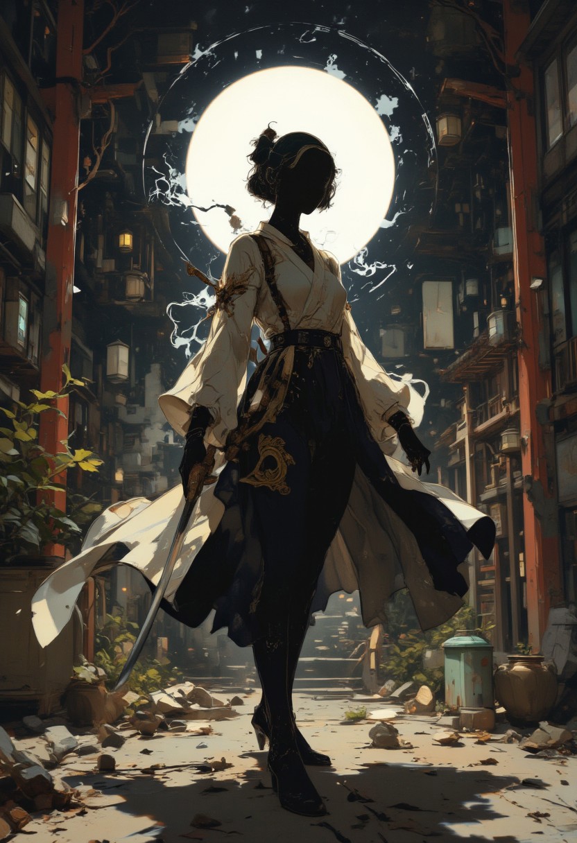 anime art,pscho_4rt, A breathtaking ultra-HD anime-style illustration of a female samurai. Japanese Culture Style, Neo Photorealistic Art, Emotional Photos, 35mm film, Young Japanese Woman in skintight black ninja bodysuit fighting for Ukraine, A Japanese sword is stuck into the ground, smoking, Japanese shrine background with a centered white circle. The atmosphere is tranquil yet powerful, evoking a sense of nostalgia and wonder. Highly detailed character, precise silhouette, cinematic lighting, ultra-realistic textures, dreamy and immersive composition, masterpiece.