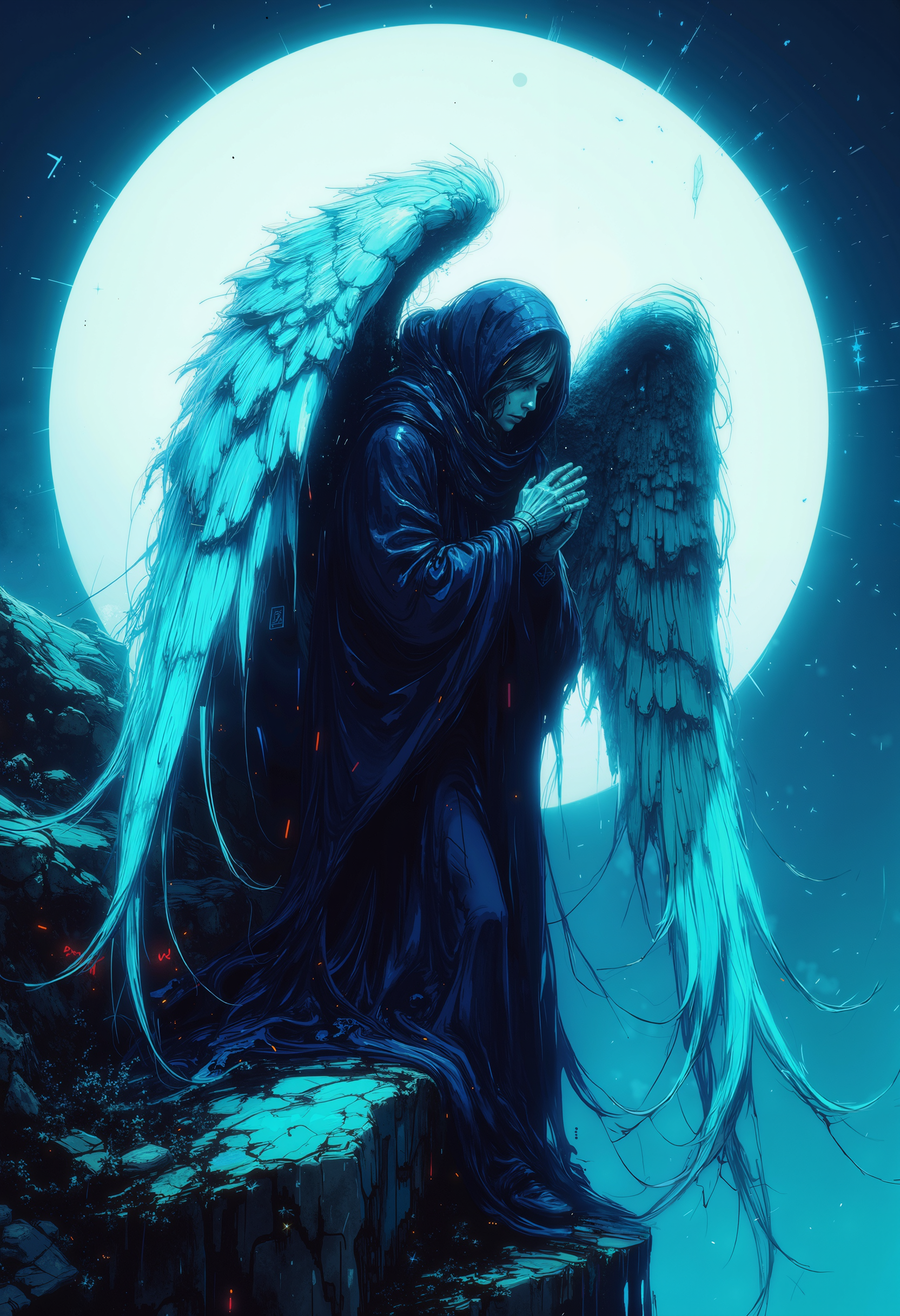 A fantastic bo-chromatic cyborg art splash in the style bo-cyborgsplash of, a digital artwork depicting a serene, mystical scene, the central figure is a figure of an angel with large, white wings, perched on a rocky cliff, the angel is dressed in a dark, hooded cloak that covers their head and shoulders, giving them an ethereal appearance, the cloak is made of a thick, textured fabric that appears to be slightly worn, suggesting a long, sleeveless cloak, and the angel's wings are intricately detailed, with a realistic texture and a soft, feathery quality, the figure's posture is contemplative, with their head bowed and their hands clasped together in front of them, as if they are deep in thought, the background features a large, full moon that casts a soft glow, illuminating the sky and casting a mystical, almost ethereal light, the cliff they are perched on is rugged and jagged, with jagged edges and a sense of depth, the overall mood is one of solitude and introspection, enhanced by the ethereal quality of the scene, colorful art cyberpunk splash, high quality, ultra detailed.<lora:boFLUX Chromatic Abyss.safetensors:1.0:1.0> <lora:boFLUX Cyborgsplash.safetensors:1.0:1.0>