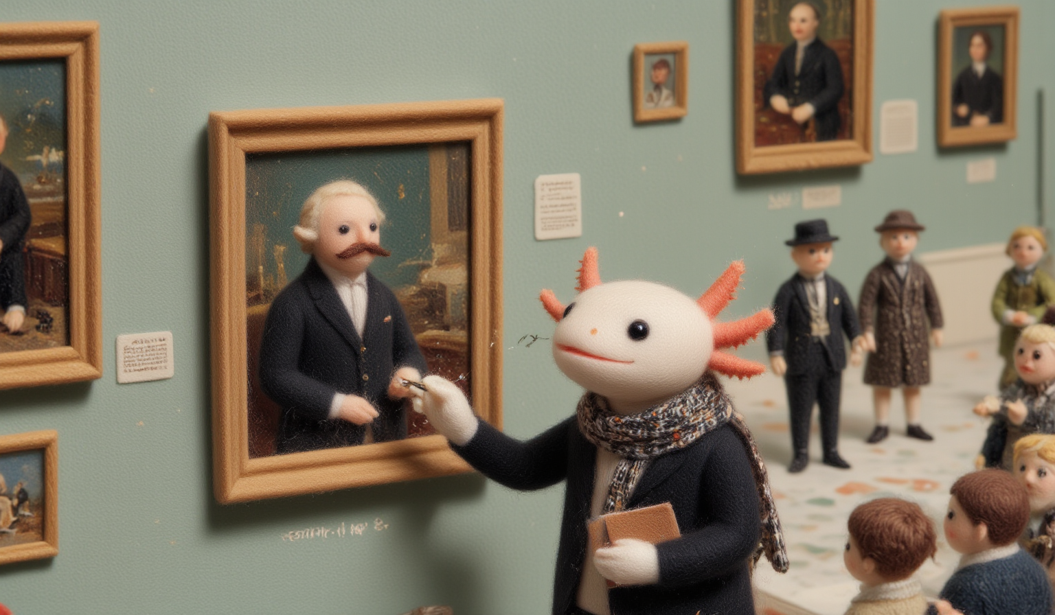 top down tilt shift image of tiny cute felt anthropomorphized axolotls with pink frilly gills and round black eyes, An axolotl dressed as a classy art patron is standing in front of a famous painting in a crowded museum, sneakily doodling a tiny mustache on the figure in the artwork when the guard isnât looking The museum is quiet and refined, with high ceilings, marble floors, and priceless artworks displayed in elegant frames The axolotlâs outfit is sophisticated and stylish, with a scarf draped artfully around its neck and a small notebook tucked under its arm Its expression is one of playful mischief as it adds the mustache, careful to keep the doodle small and subtle so that only the most observant viewers will notice the alteration to the masterpiece<lora:Axomodel_Flux_V2.safetensors:1.0:1.0> <lora:felt.safetensors:1:1>