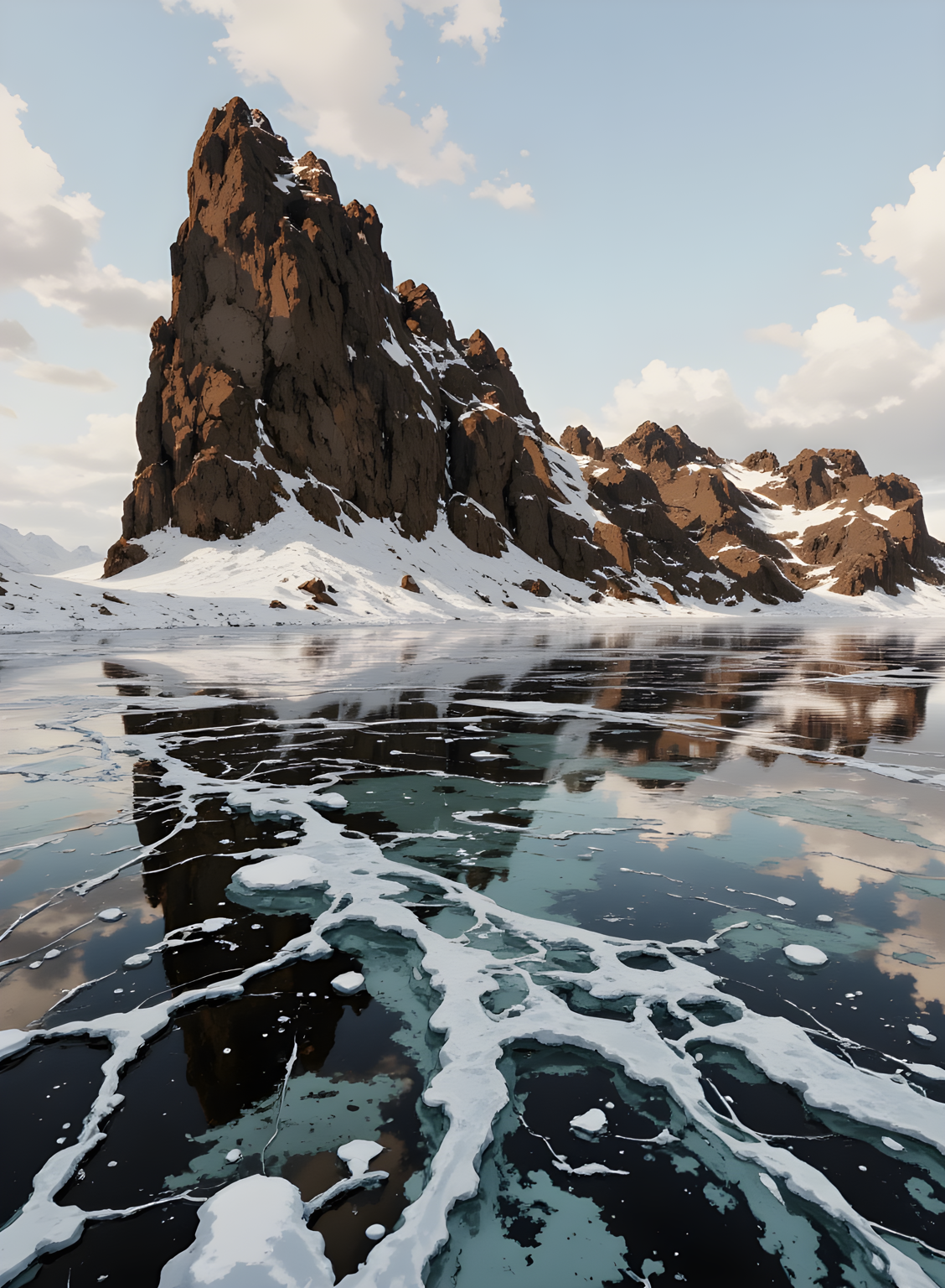 The scene unfolds under a vast, serene sky that stretches endlessly above, its canvas painted in soft hues of pale blue and white. The horizon is barely visible, blending seamlessly with the distant outlines of rugged mountains that rise like ancient sentinels, their peaks dusted lightly with snow. The air carries an ethereal stillness, as if time itself has paused to admire the raw beauty of this frozen landscape. Dominating the foreground is a massive expanse of ice, its surface a tapestry of intricate patterns etched by natureâs own hand. The ice is not smooth but alive with cracks and fissures, each line telling a story of the cold's relentless grip on the water below. These fractures create a mesmerizing network of veins, some thin and delicate, others bold and jagged, all reflecting the light in varying shades of deep blue and translucent white. Patches of snow rest upon the ice, scattered like fragments of a forgotten dream, adding texture and contrast to the otherwise monochromatic palette. In the middle ground, a towering rock formation stands defiantly against the icy backdrop. Its dark, weathered surface is a stark contrast to the pristine whiteness surrounding it. The rock appears ancient, its edges worn yet sharp, as though carved by the wind and water over countless millennia. At its base, where the rock meets the ice, a thick layer of frost clings stubbornly, forming a crown-like halo around its lower half. This frost is not uniform but rather uneven, suggesting the dynamic interplay between the solid rock and the shifting ice beneath. The reflection of the rock formation dances across the glossy surface of the ice, creating a mirror image that blurs the boundary between reality and illusion. The reflected lines are softer, more fluid, as if they are part of a dream world just out of reach. The interplay of light and shadow accentuates the contours of both the real and reflected forms, giving the scene a sense of depth and mystery. Above, the sky remains calm, its colors muted yet vibrant, hinting at the approach of either dawn or dusk. The light is soft, casting gentle shadows that enhance the textures of the ice and rock. There is no sound, no movementâonly the quiet presence of nature, untouched and eternal. This is a place where time seems to stand still, where the elements have conspired to create a masterpiece of solitude and beauty. It is a world of contrasts: the hardness of the rock against the fragile delicacy of the ice, the warmth of the sunlight against the chill of the frozen waters. Here, one feels small, humbled by the grandeur of the natural world, yet profoundly connected to its timeless rhythm. j_art, anime, anime art, <lora:FLUX\jul\J_Anime:0.7>, <lora:FLUX\RealAnime:0.7>