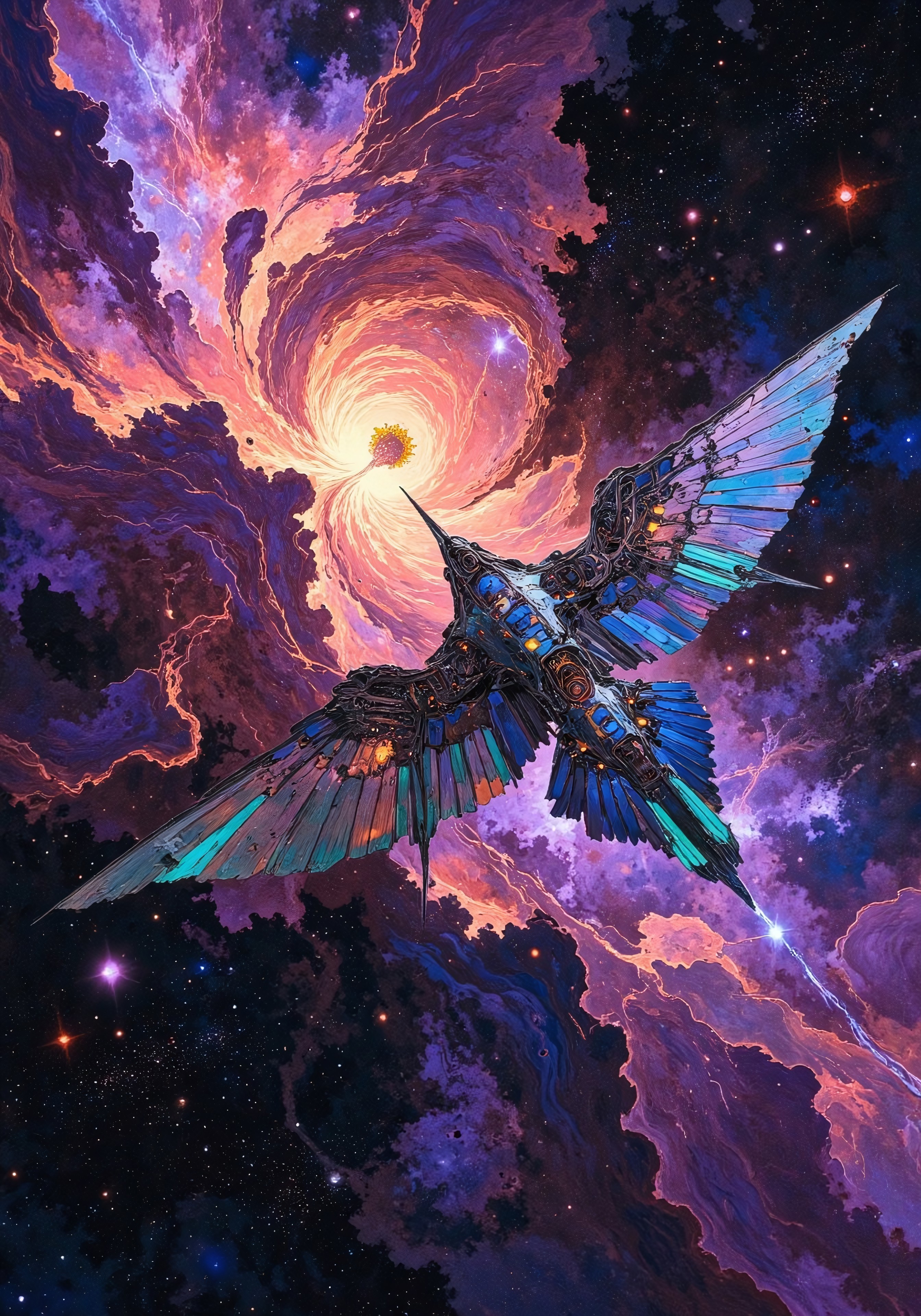 Masterpiece, best quality, A colossal starship, shaped like a hummingbird in mid-flight, soars through the cosmic abyss. Its sleek, metallic form gleams with the soft luminescence of distant stars, and its vast, outstretched mechanical wings have solar panels instead of feathers that pulse with radiant energy, shimmering with iridescent hues of deep sapphire, emerald, and violet. The beak-like prow of the vessel is a finely crafted marvel of engineering, tapering to a sharp point as it glides effortlessly through space. The thrusters, instead of tail feathers, gleam with powerful light, rippling with blues, purples, and golds. Ahead, an enormous nebula blooms in the shape of a hibiscus flower, unfurling across the stars. Swirling tendrils of gaseous pinks, fiery oranges, and deep, intoxicating violets spiral outward, its glowing center pulsating like the heart of the universe itself. Wisps of stardust drift in the void, curling around the starship like an unseen wind guiding it toward its destination. The scale is breathtaking—this hummingbird-shaped vessel is the size of a floating city, yet it moves with the grace of its avian inspiration. The contrast between mechanical precision and cosmic grandeur creates a sense of awe and wonder, as if the universe itself had conspired to craft both machine and nebula in a perfect, poetic harmony. DB4RZ, DB4RZ style painting, in the style of ck-sfc,