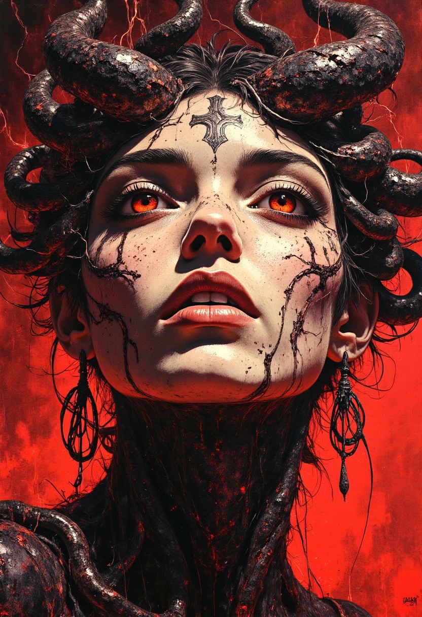 "Lilith," supreme demon queen, hell-born overlord, hyperdetailed, 8k resolution concept art, WLOP, H.R. Giger, Royo, deep crimson and obsidian tones, hyperrealism, digital painting, piercing ember-red eyes that glow like molten lava, blackened veins creeping across flawless porcelain skin, intricate infernal sigils seared into her forehead, crowned with jagged, bloodstained horns curling toward the heavens, lips curved in a cruel smirk, fangs barely visible, smoke rising from her skin as if she is forged from hellfire, ethereal shadows twisting around her shoulders, the embodiment of ancient evil and unholy beauty, rendered in surreal, cinematic lighting by Pablo Amaringo.