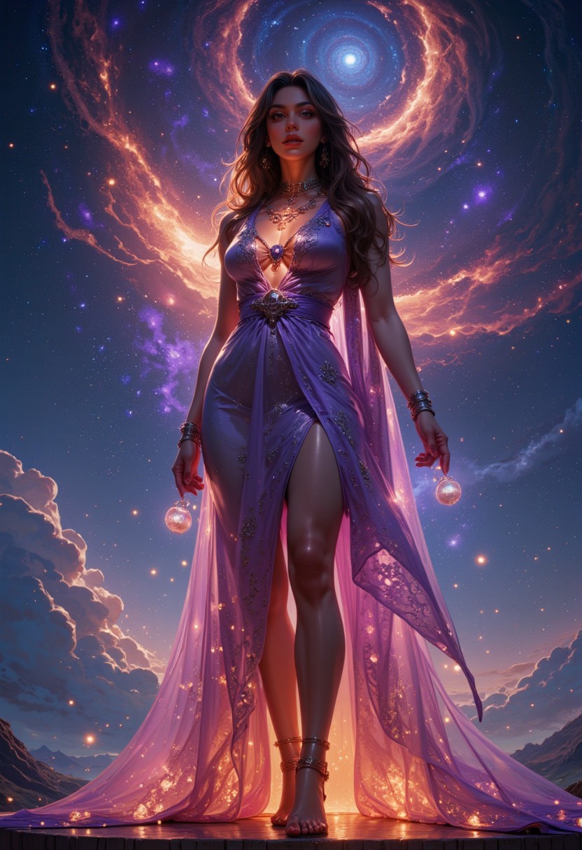 G0thicL1nes, A statuesque woman with luminous, pearl-like skin that glows faintly, as if lit from within by starlight. Her curves are accentuated by a flowing, semi-transparent gown made of shimmering cosmic fabric that clings to her form, revealing just enough to hint at her figure. The gown shifts colors like a nebula, blending deep purples, blues, and golds, with tiny, glowing constellations scattered across its surface. Her long, flowing hair seems to float weightlessly, strands catching the light like strands of silk in zero gravity. Her eyes are pools of liquid silver, reflecting galaxies, and her lips are a soft, inviting shade of rose-gold. Around her neck, she wears a delicate, glowing pendant shaped like a crescent moon, and her wrists are adorned with bracelets that hum faintly with energy. She stands on a floating platform in the middle of a vast, star-filled void, surrounded by swirling cosmic dust and glowing orbs of light that drift lazily around her. Her pose is confident yet relaxed, one hand resting on her hip while the other gently cradles a glowing orb of stardust. The air around her seems to shimmer with warmth and energy, and her presence exudes both power and grace. The background is a breathtaking view of a distant galaxy, with swirling nebulae and stars casting a soft, ethereal glow over the scene.