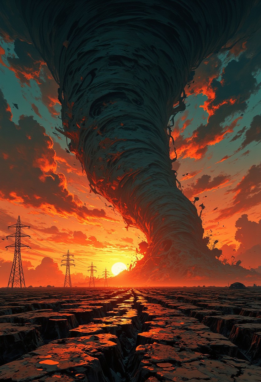 A breathtaking cinematic masterpiece in the style of Studio Ghibli, blending retro comic art with hyperrealistic detail. A vast, fractured farmland stretches beneath a stormy twilight sky, illuminated by dramatic platinum-hued holy lighting and eerie black-light accents. Towering electric transfer towers stand stoic and buffed, their sleek forms cutting through the chaotic scene like silent sentinels. In the distance, a colossal swirling tornado dominates the frame—it's a wide vortex made of dust and debris tearing violently through the landscape, debris spiraling in wild, chaotic motion against a bloody sunset. The camera captures the towering funnel from a low-angle perspective, emphasizing its overwhelming scale and destructive force. Storm clouds churn with a hyper-detailed, atmospheric texture, bathed in a mix of soft orange glow and stark, shadowy contrasts. Rendered in 8K UHD, cinema-quality still shot, with a retro yet hyperrealistic art style—highly dramatic, atmospheric, and brimming with intricate details.