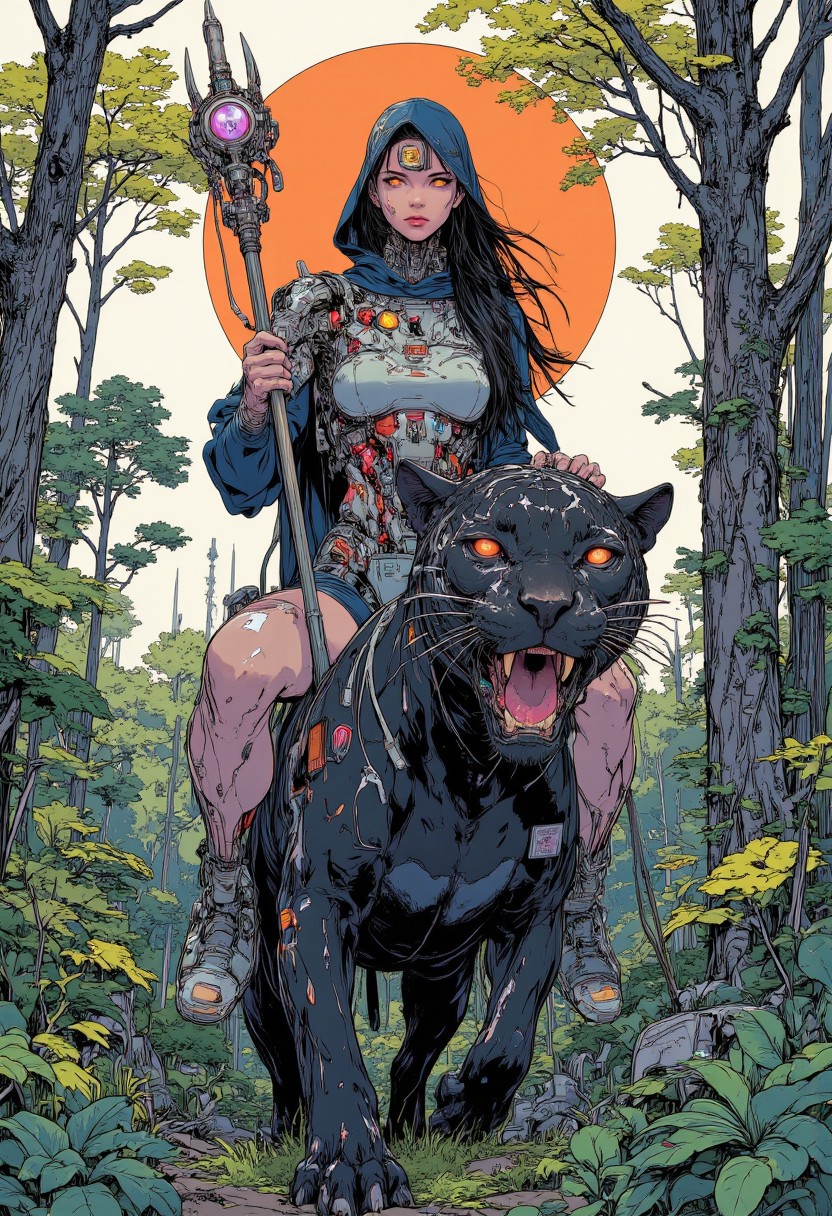 scifi, fantasy, masterpiece, best quality, great composition, Japanese Culture Style, Neo Photorealistic Art, Emotional Photos, 35mm film, a highly detailed fantasy scene set in a dense, lush forest. The central figure is a fierce mechanical cyberpunk warrior woman with a muscular physique, fair skin, and long, dark hair peeking out from beneath a dark blue hooded cloak. She wears a form-fitting, metallic breastplate armor that showcases her ample breasts and a short skirt that exposes her thighs. Her expression is determined. Riding on the back of a massive, dark panther is the warrior woman. The panther's fur is sleek and glossy, with a menacing glare and bared teeth, suggesting a formidable and loyal companion. The warrior holds a long, ornate staff with a glowing gem at the top, adding to the mystical atmosphere. The background is filled with towering trees and thick undergrowth, their leaves a mix of green and yellow hues, creating a vibrant and lively forest environment. The light filtering through the dense foliage casts a soft glow, highlighting the textures of the armor and the panther's fur. The overall style of the artwork is highly detailed and realistic. anime, cyberpunk, A digital anime artwork in the style of cklg, (orange moon in the background), vibrant colors, high contrast